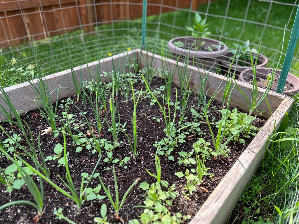 I’ve decided to plant tomatoes, peppers, onions, and herbs this year (plus as you can see in my garden, there’s lots of weeds and tomato plants popping back up from last year, so I need to do some weeding!).