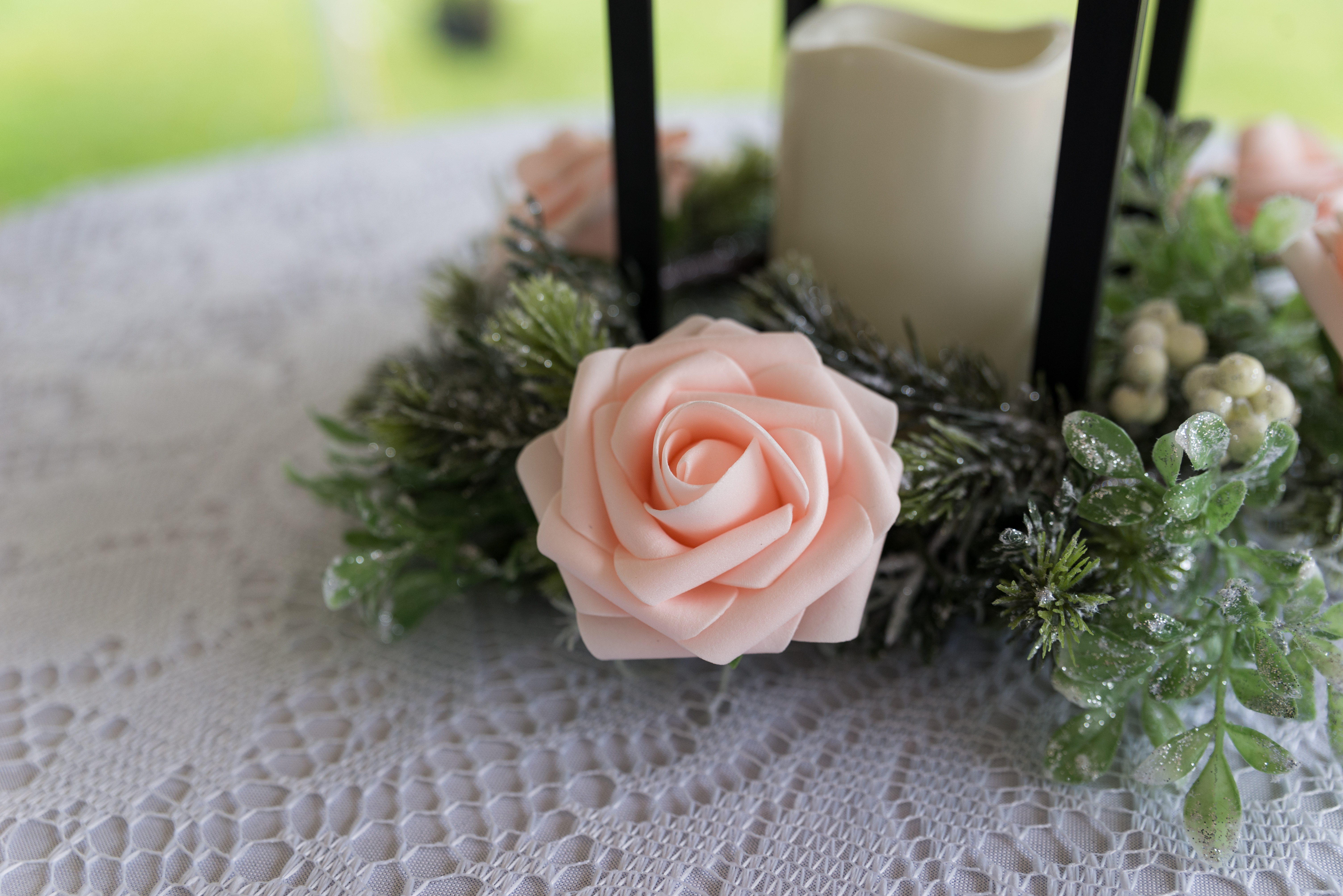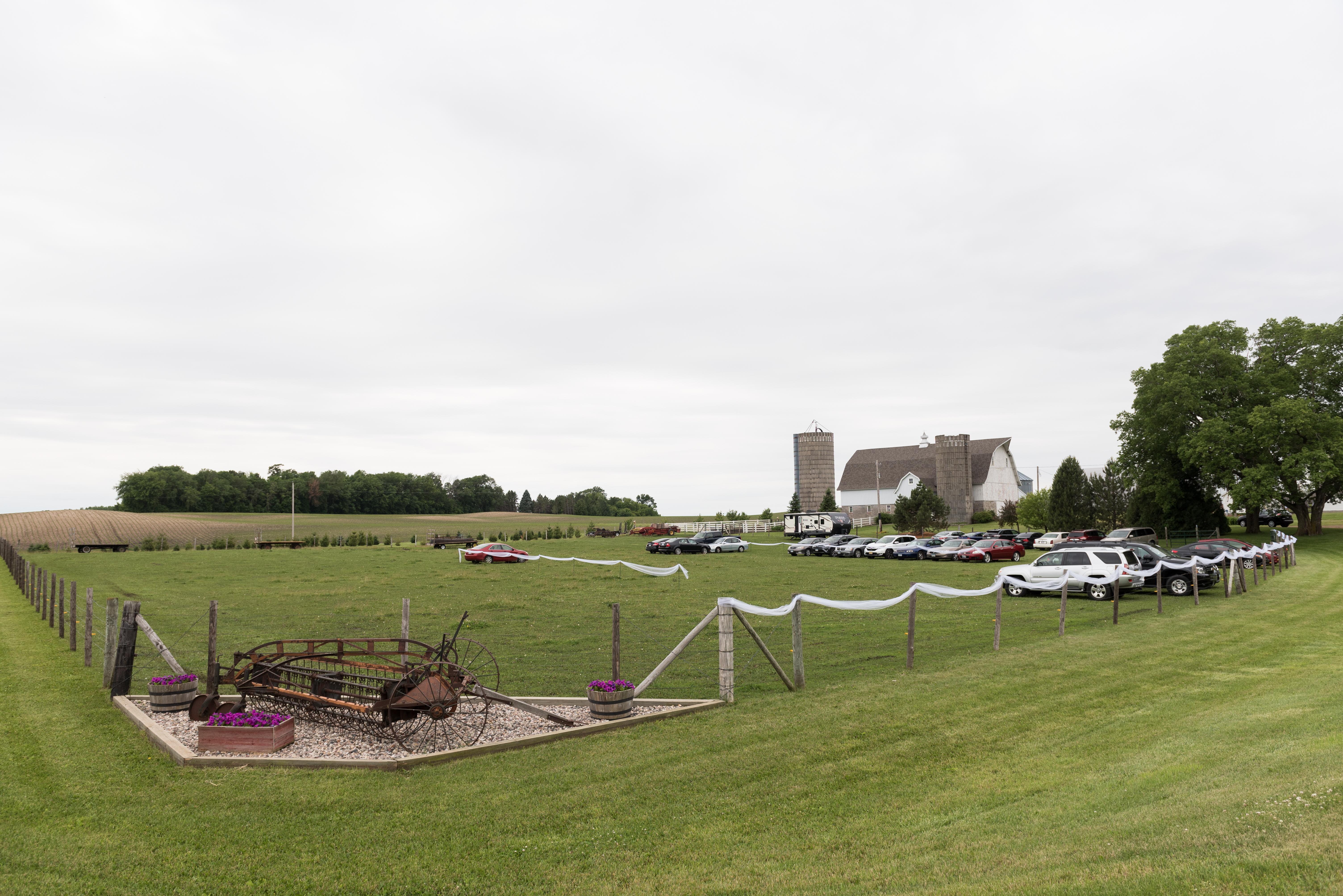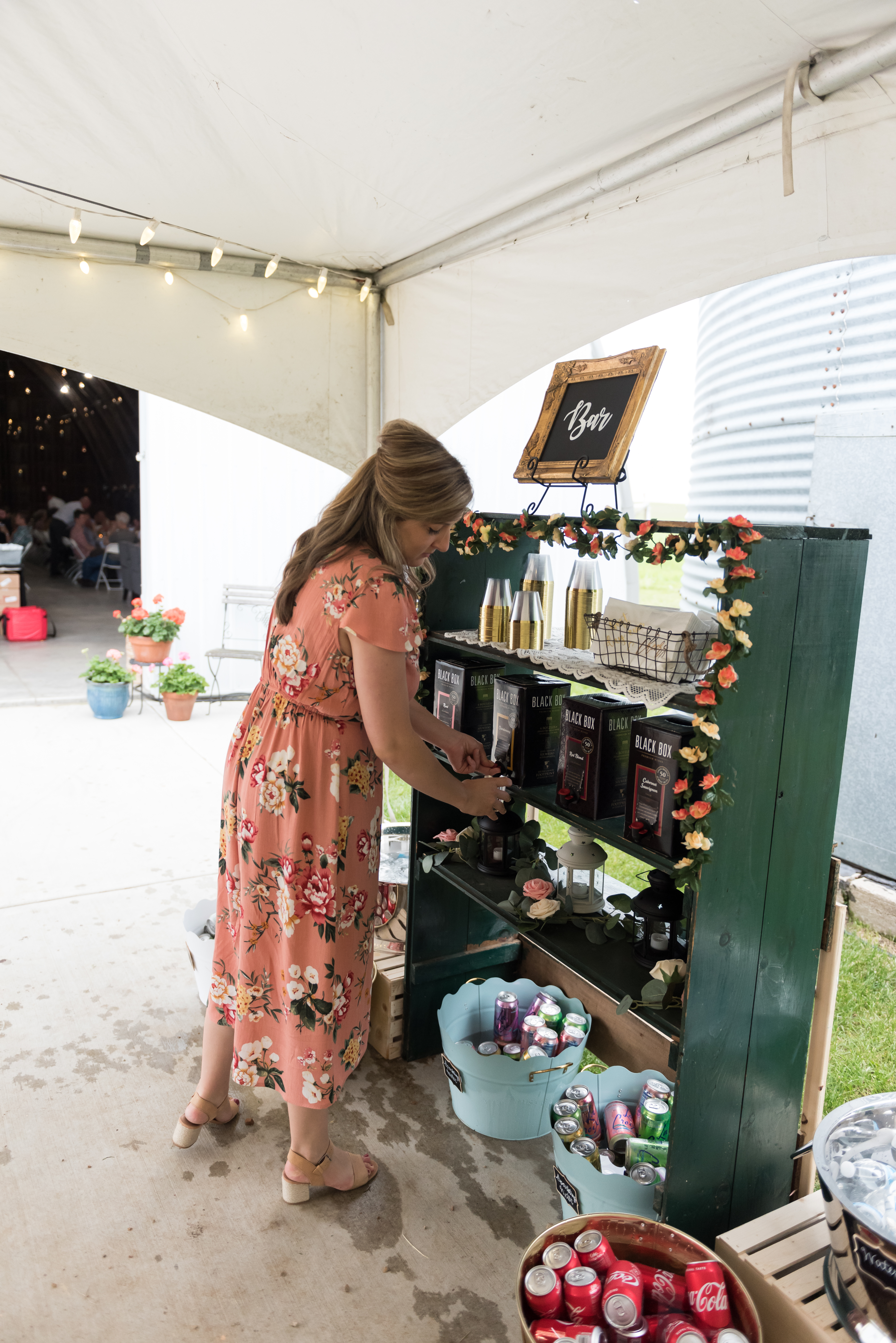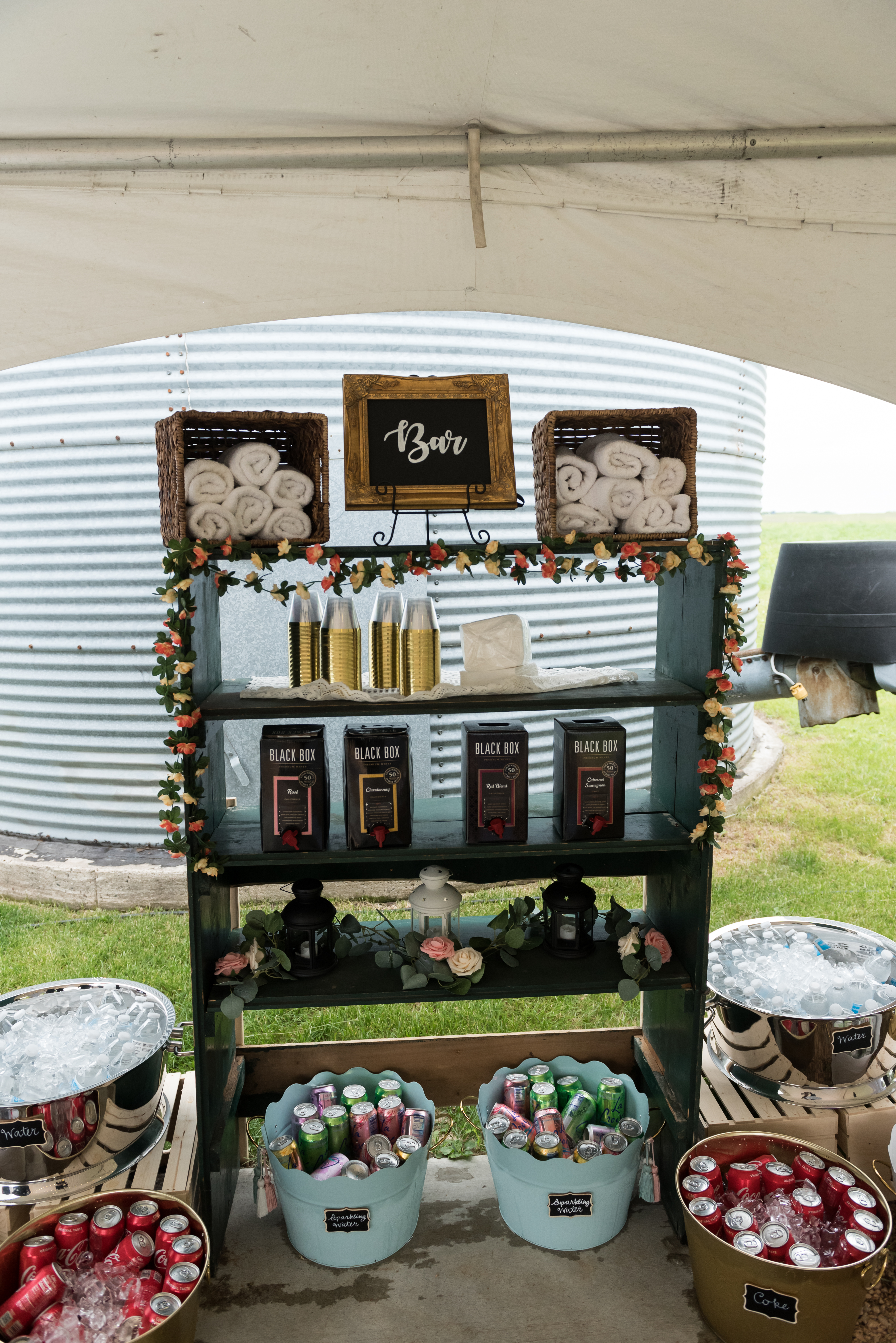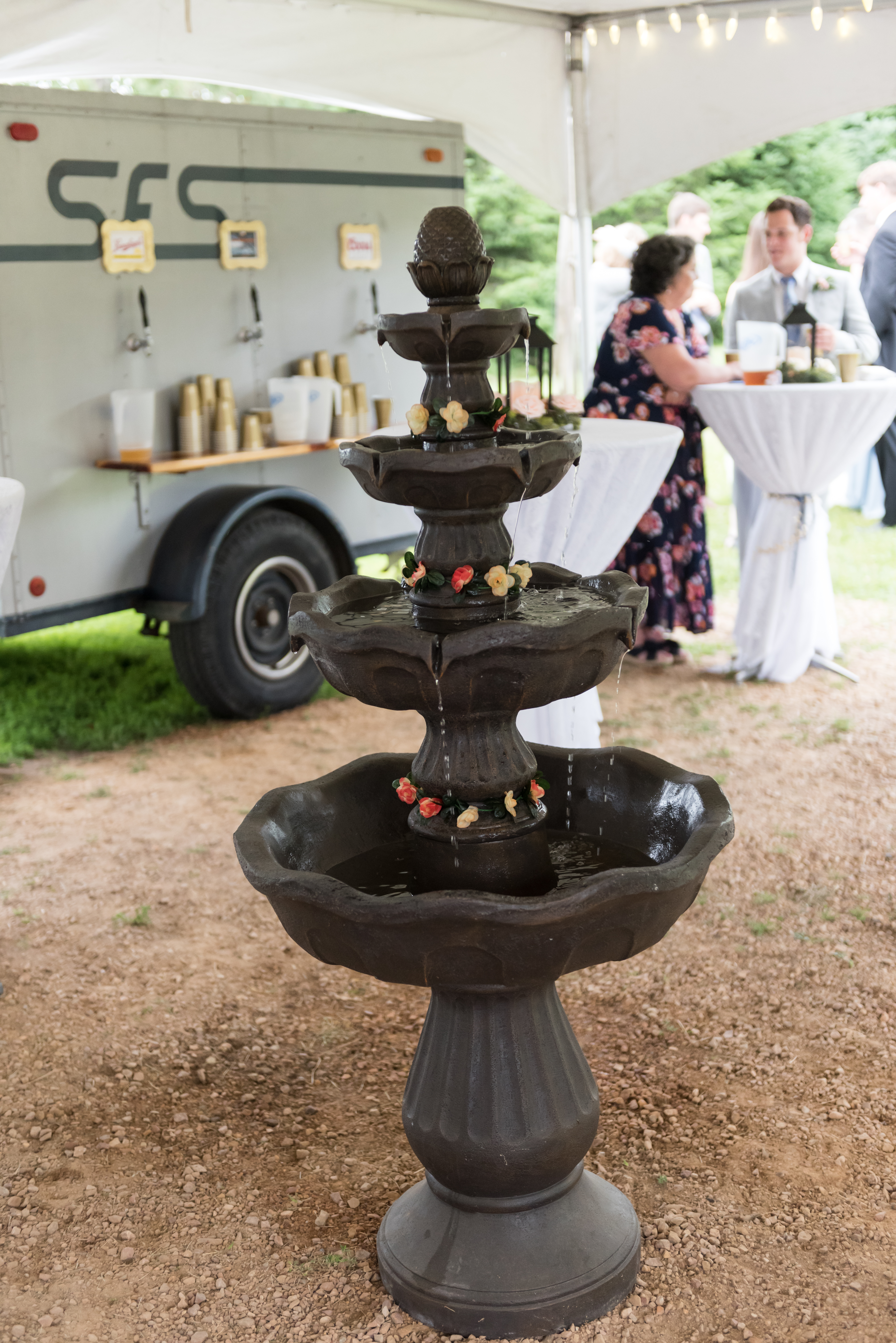 We had a self-serve “bar” with a refrigerated keg trailer and a lot of boxed wine. The shelf the wine is on was salvaged from an old DNR building up north. I wanted a fountain in the middle of the cocktail area so my parents found one on clearance at Menards (how Minnesota can we get?) and made it happen. The only downside was my little cousins kept trying to dump frogs in it and I had to keep saving the poor jumpy creatures. The wreaths around the lanterns were 90% off Christmas wreaths at JoAnn’s that I added flowers to to make un-Christmassy. For snacks we had a trail mix bar. I insisted on loading up on Easter M&Ms in April because I like the pastel colors so much more than the regular colors. That was truly my biggest wedding diva moment.