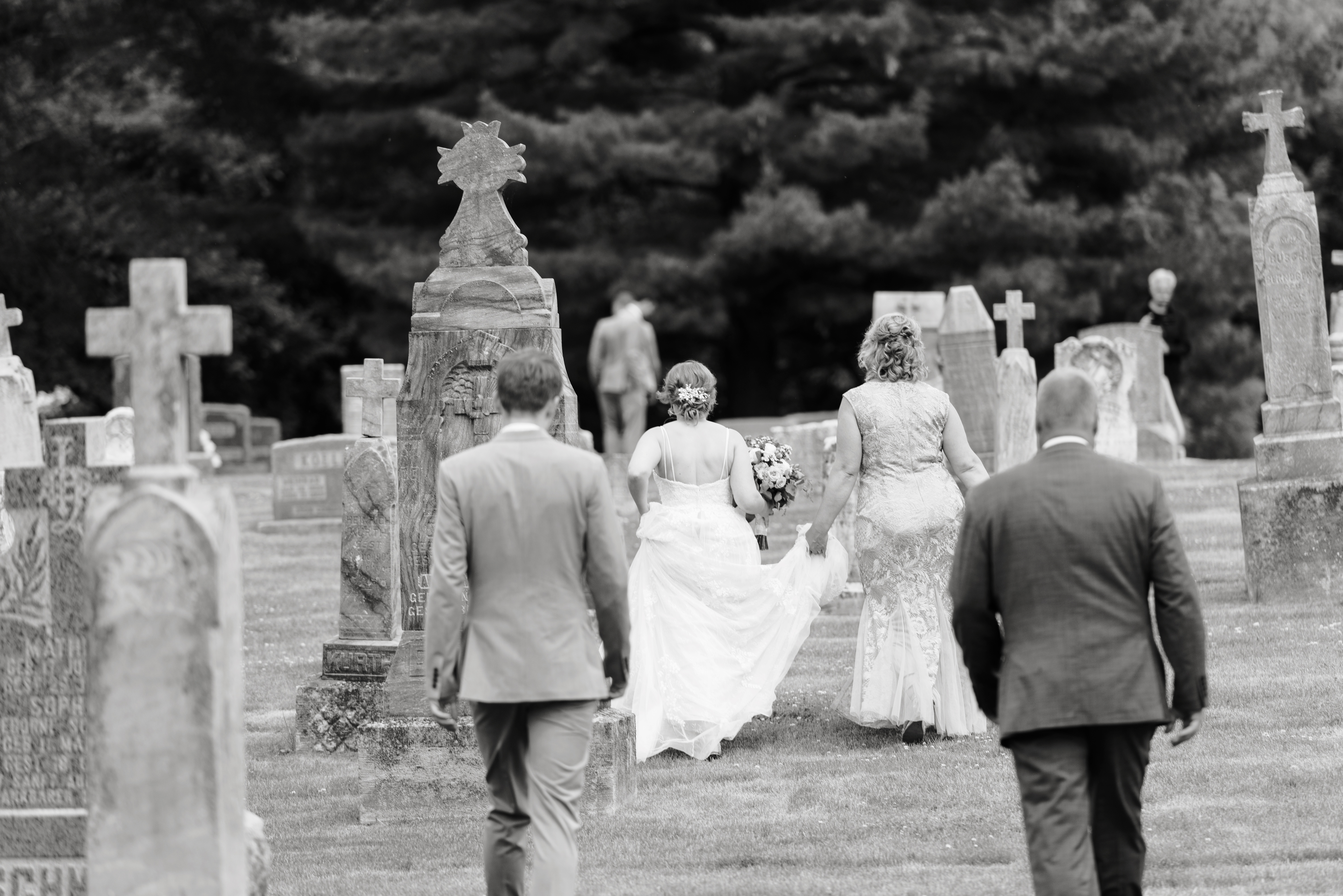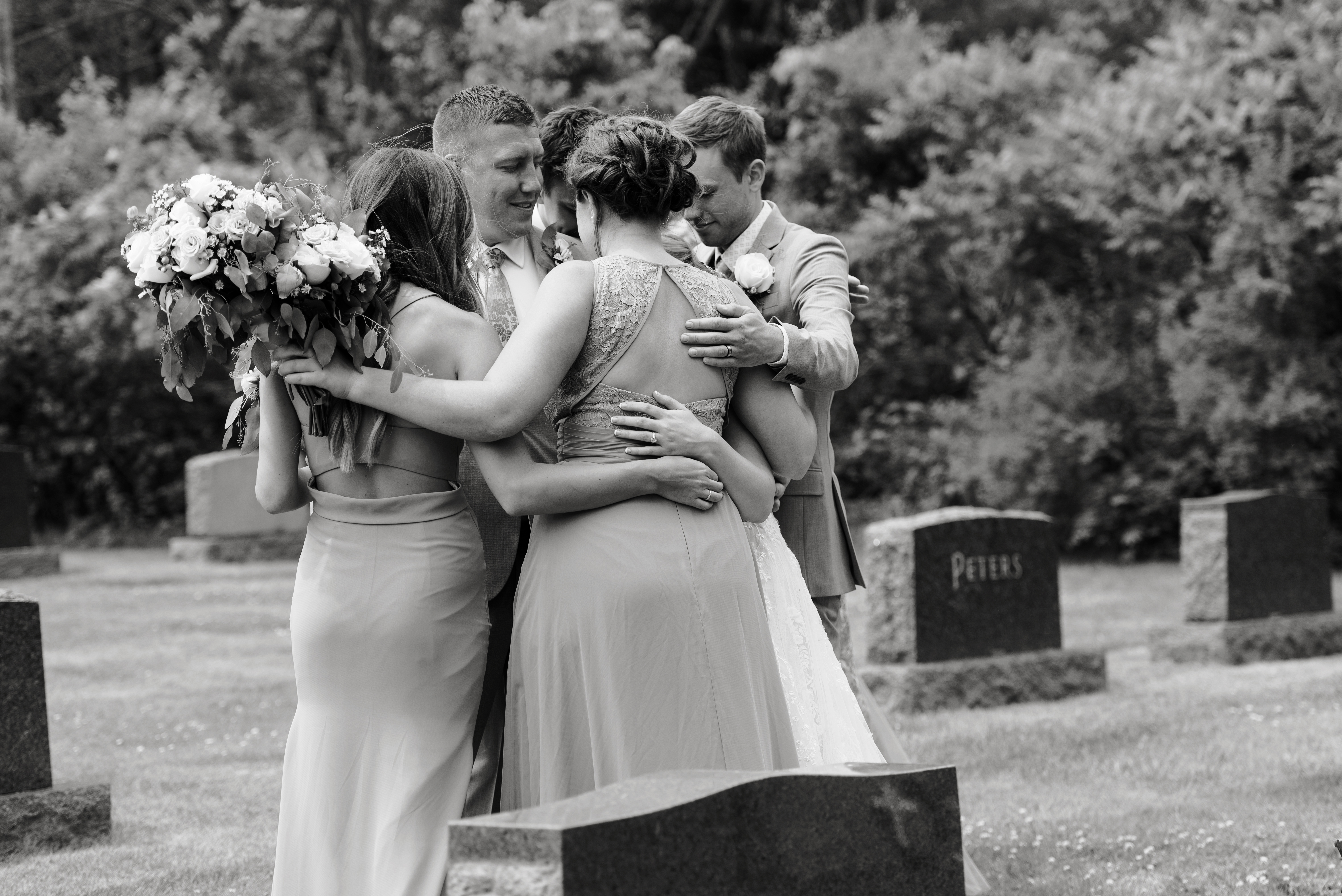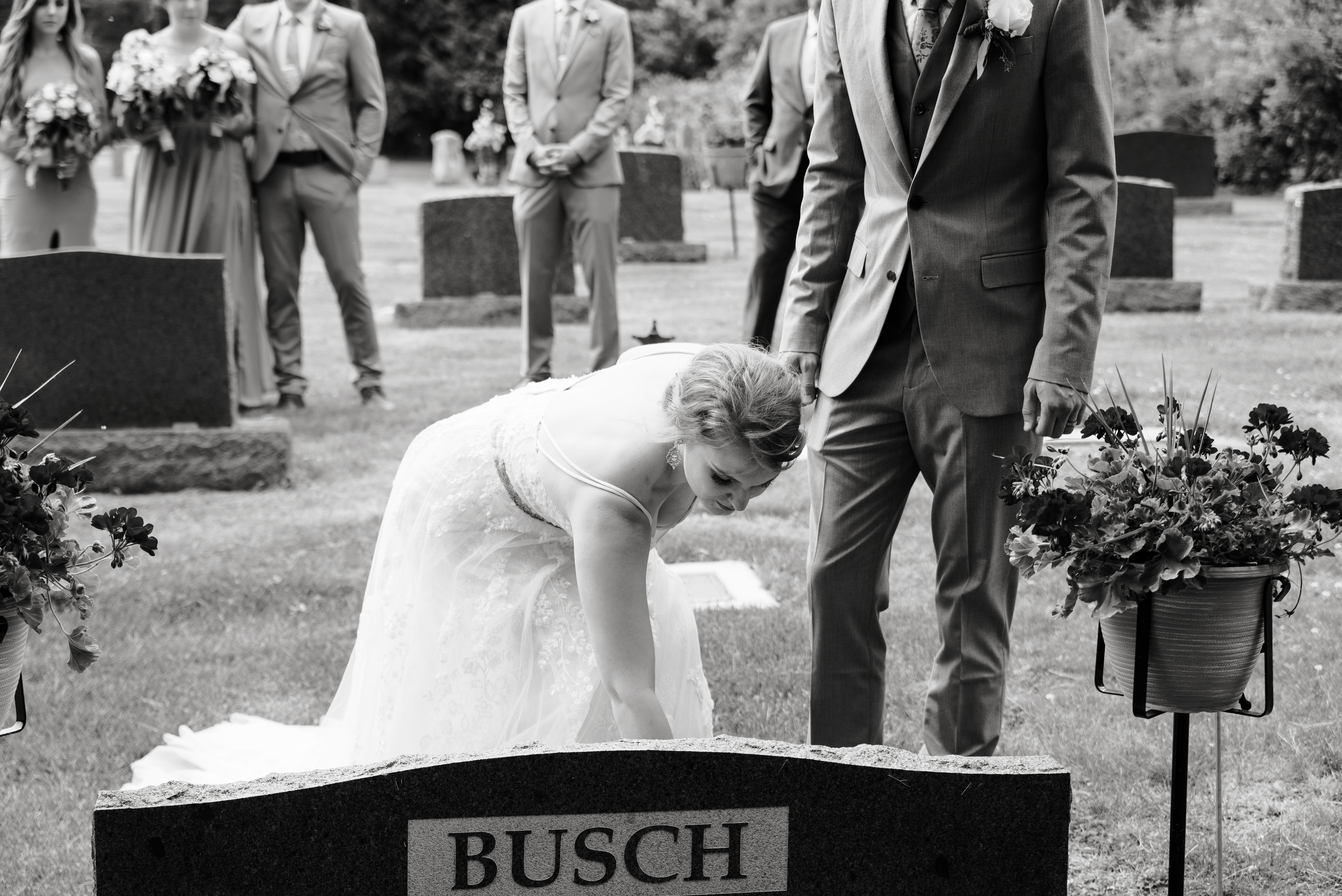 You’re probably wondering why the heck there’s a section for “cemetery” in a wedding post, but it’s not a mistake! Like I said, I’m a sucker for sentimental. When I was younger, if you’d have asked me what my wedding looked like, I would have said it would be at St. Benedict church, where I was baptized and my parents were married. I would have said my grandparents would be there, front row. Well, a few years before my wedding, that church closed and was torn down. A year and a half before my wedding, my grandmother died. Six months later, my grandfather followed. They were both buried in the St. Benedict cemetery, even though the church no longer stood there. So, very early on in my wedding planning, I knew I wanted to spend part of the day at the church site, take pictures in the trees where my parents had their wedding photos taken and visit my family in the cemetery. The church is only half a mile from my parent’s house, halfway between their farm and the farm that used to be Grandma Brooks’ before she died in 2010 and we had to sell it. My uncle Steve and aunt Mary Elizabeth were also buried in this cemetery, so we laid flowers for them as well. I wanted to visit my other grandparents and Auntie Nancy at the cemetery in town as well, but we ran out of time that day.