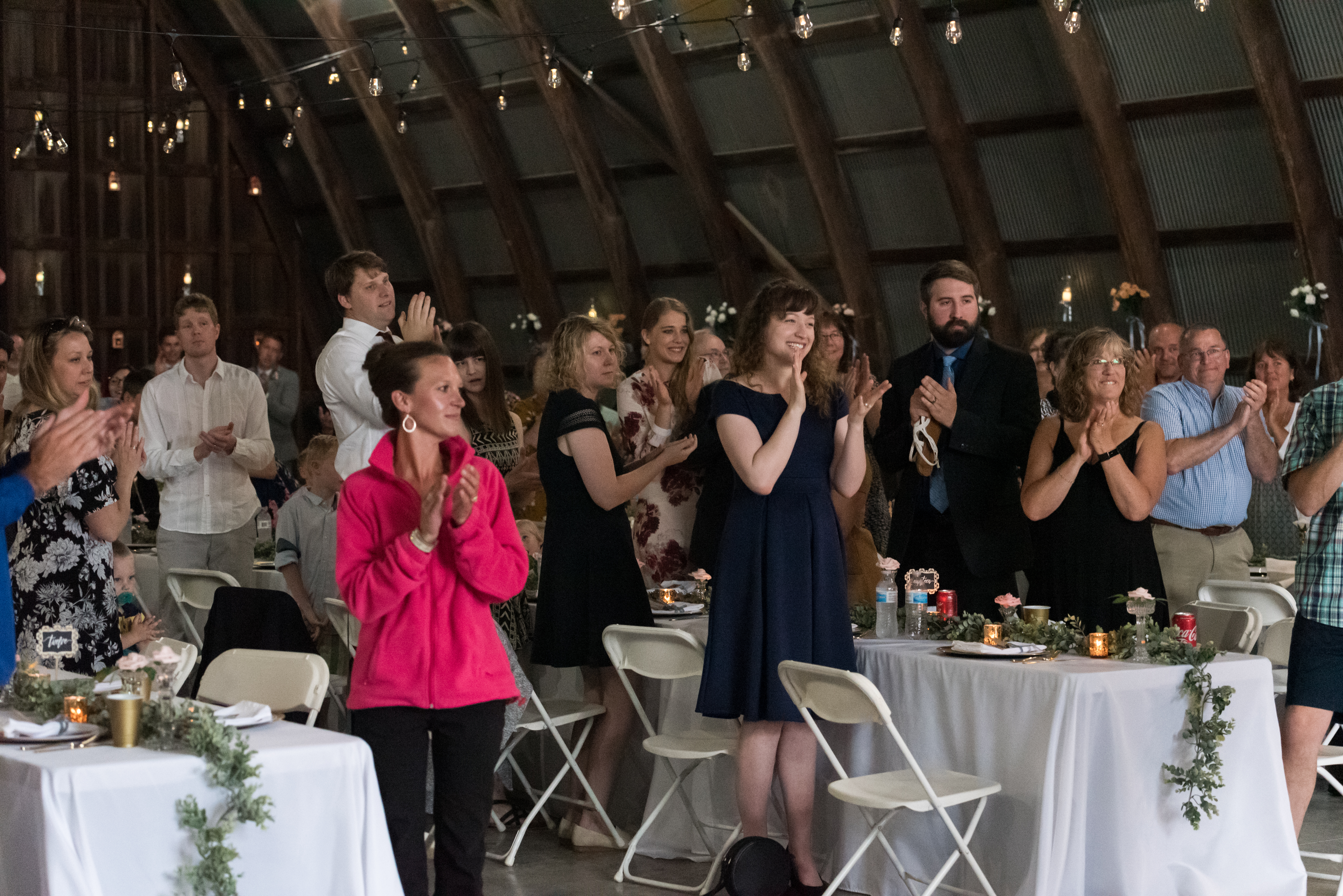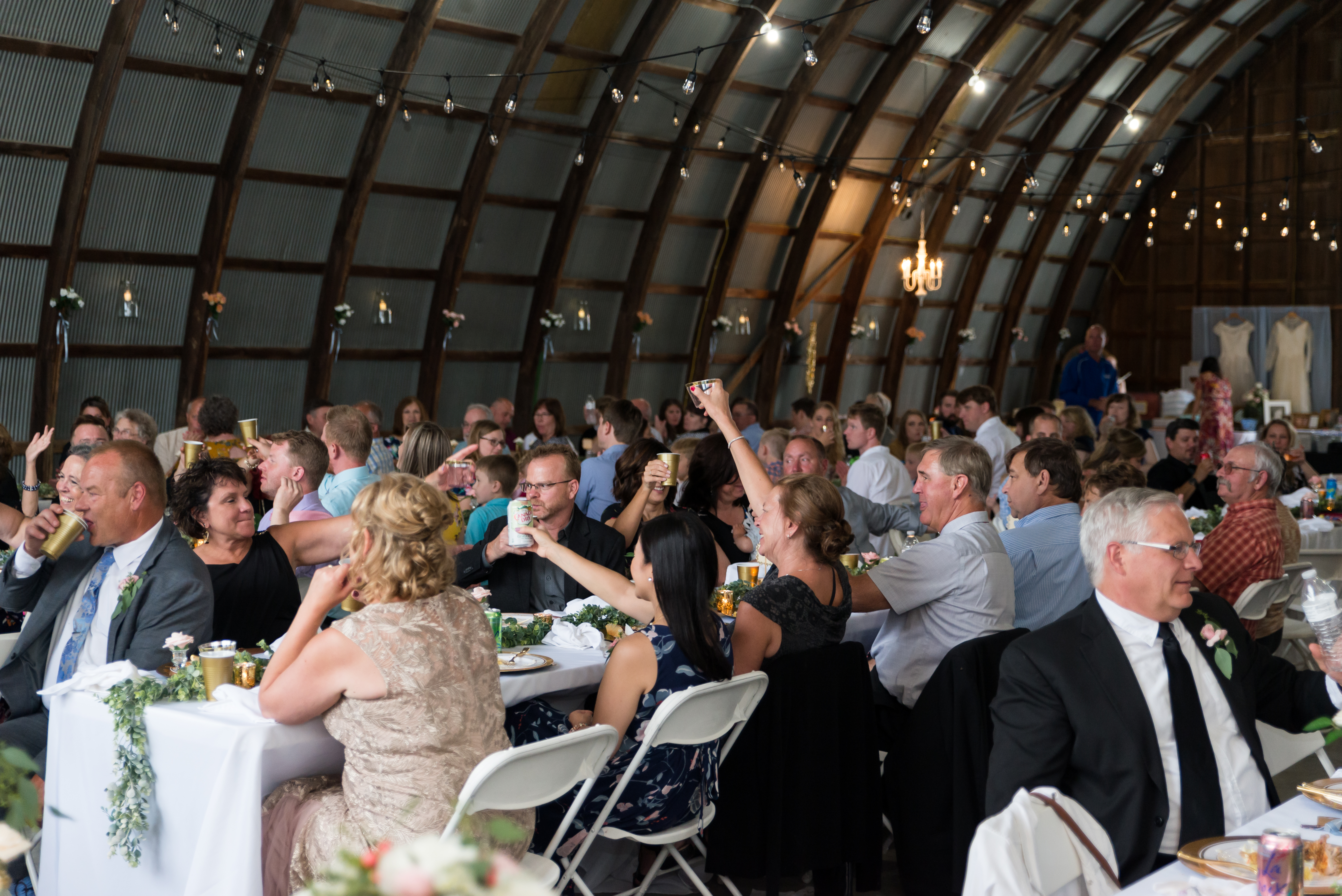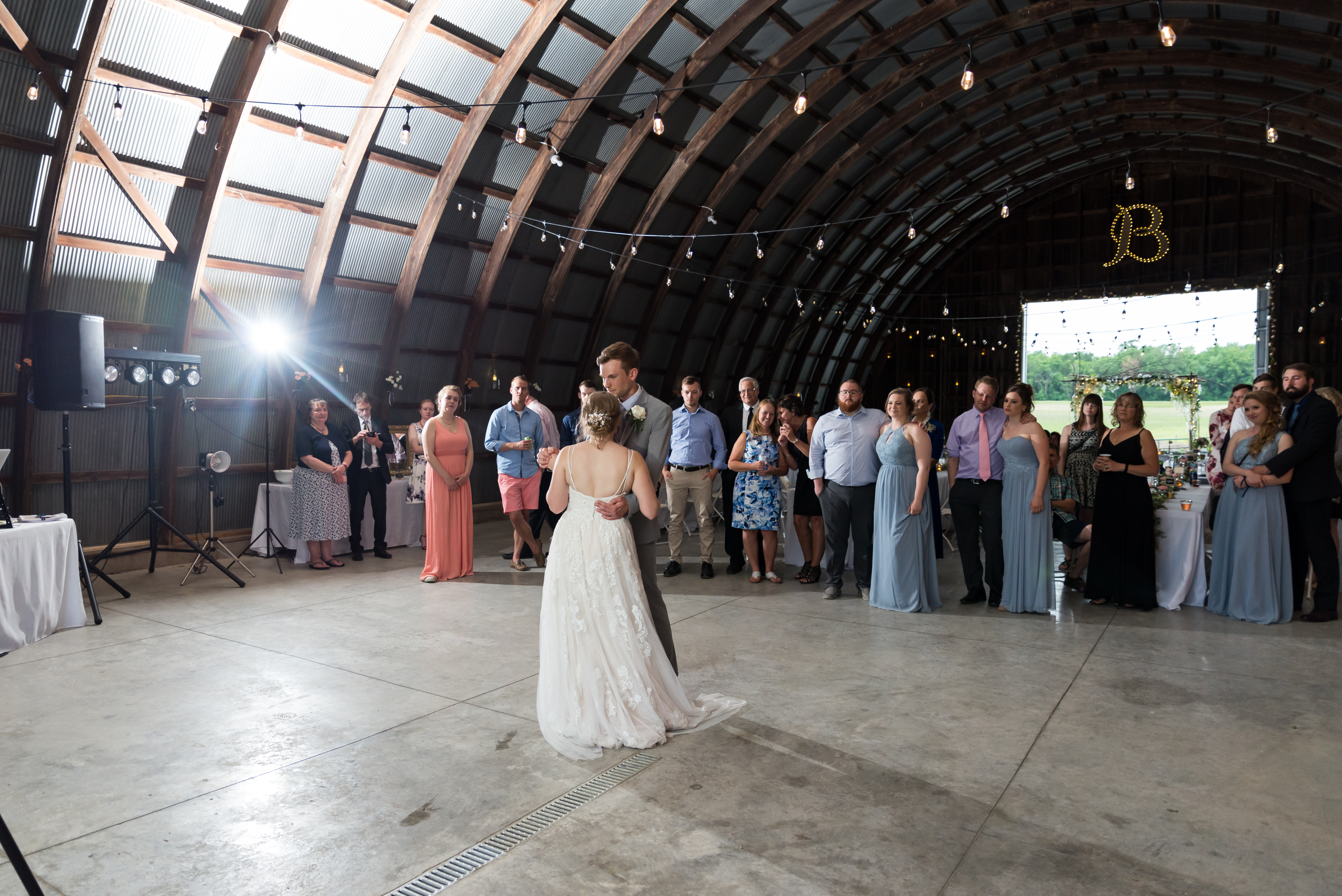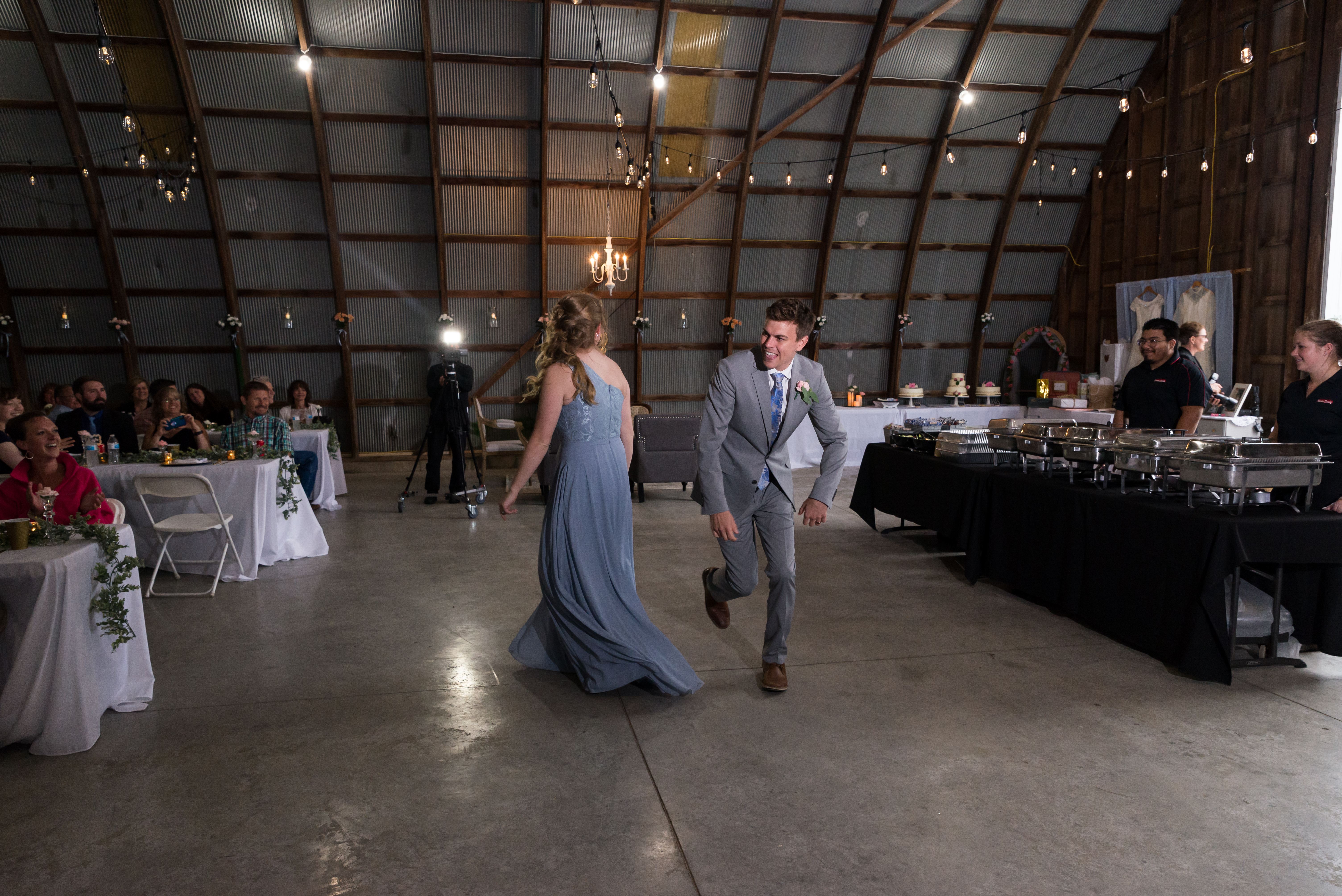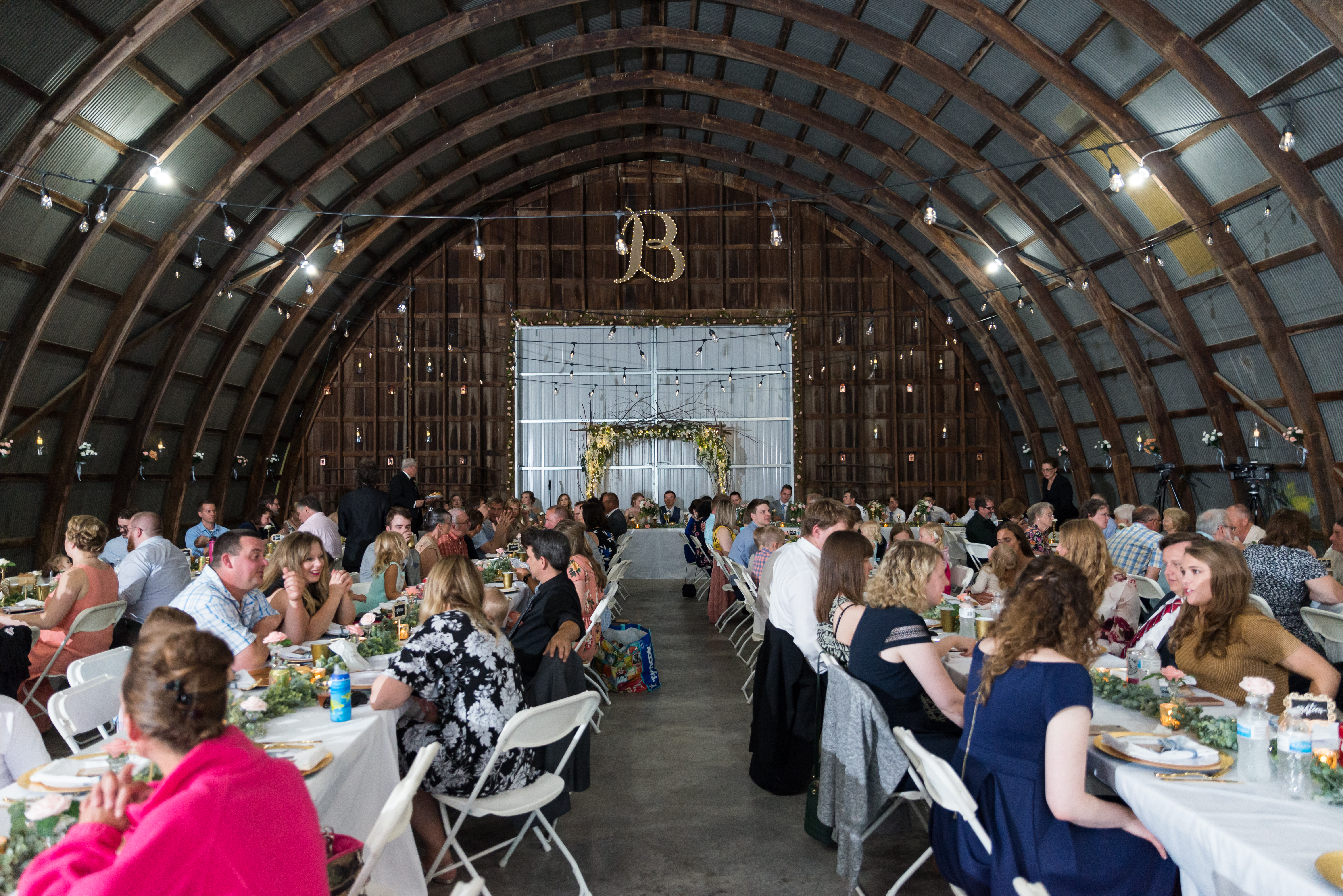 We had our reception in the machine shed, a pretty plain, nondescript building, but it hosts a party really well. I just decorated the crap out of it with lanterns and garlands until hopefully you didn’t walk in and expect a Haybine to hit you in the face. We had a relatively small wedding–we invited 175 people and 150 people showed up. We had a huge head table and then four reception tables, arranged Hogwarts Great Hall style. Famous Dave’s did a buffet (though I made sure to have as many vegetarian options as possible) and Thirsty Whale Bakery made our Lemon Raspberry, Red Velvet, and Mocha Fudge cakes. We did all the speeches and the dances. I do not like cheesy weird traditions (though if you do, great, we’re all different!) so there was no shoe game, dollar dance, garter toss, bouquet toss, or anything else uncomfortable.