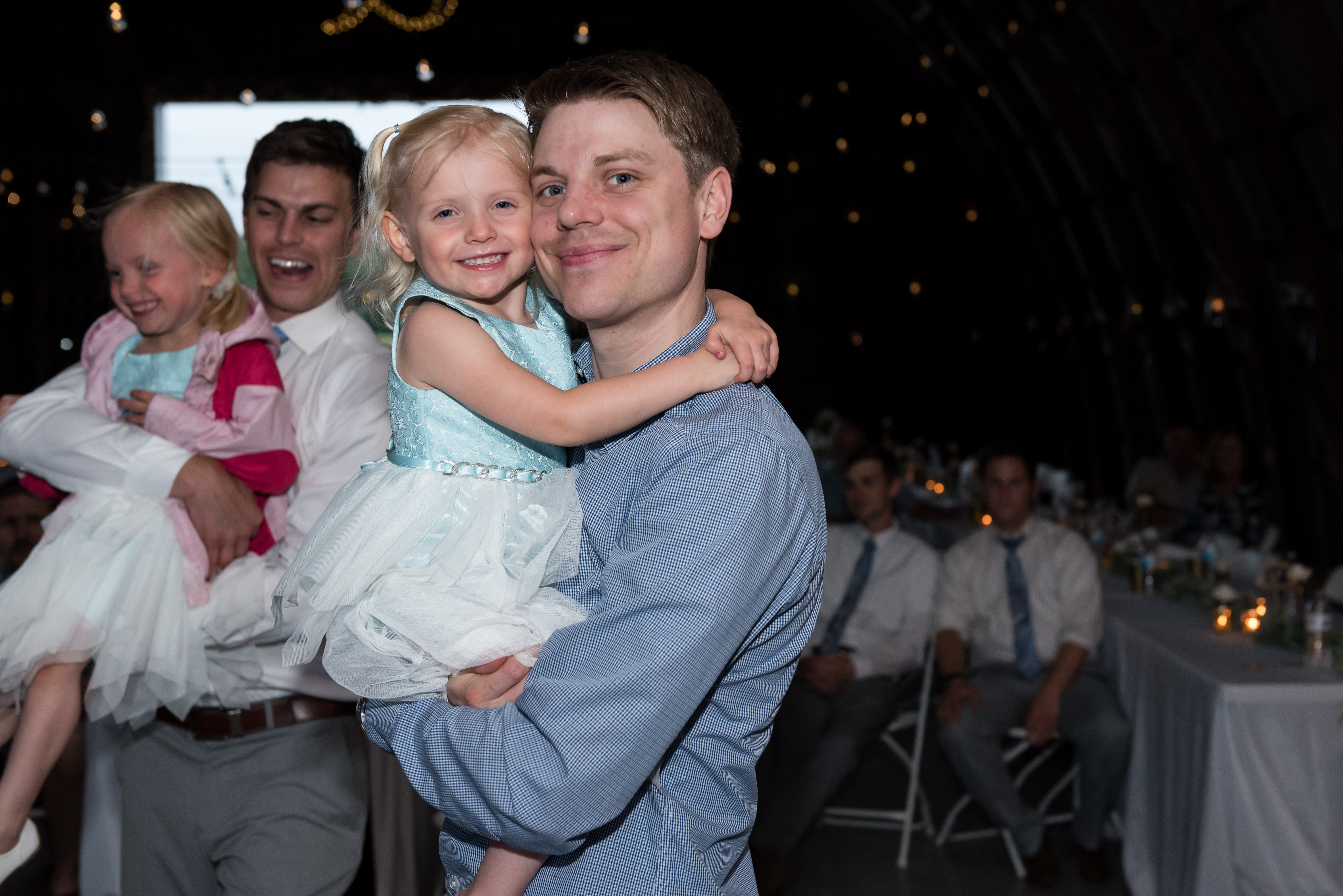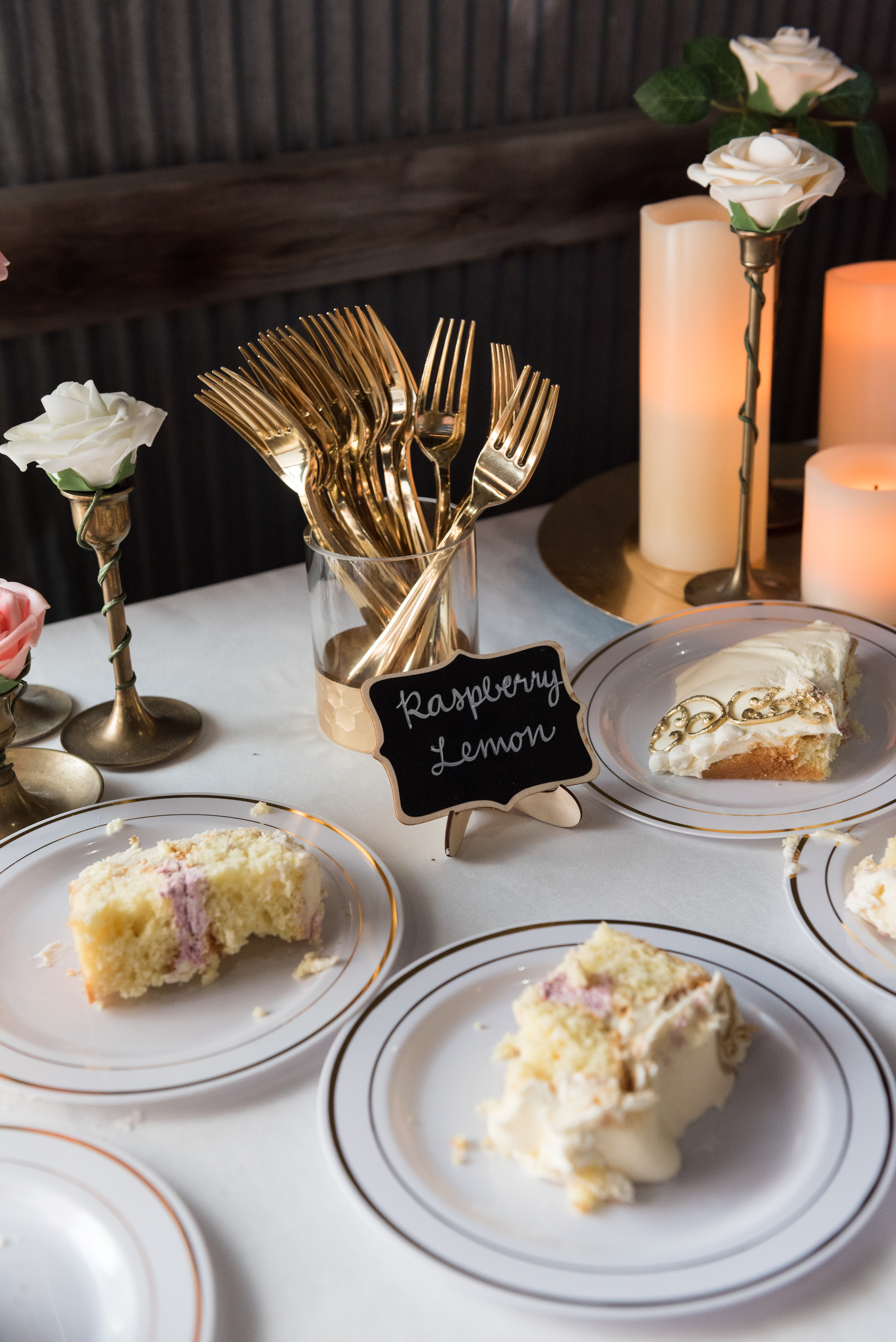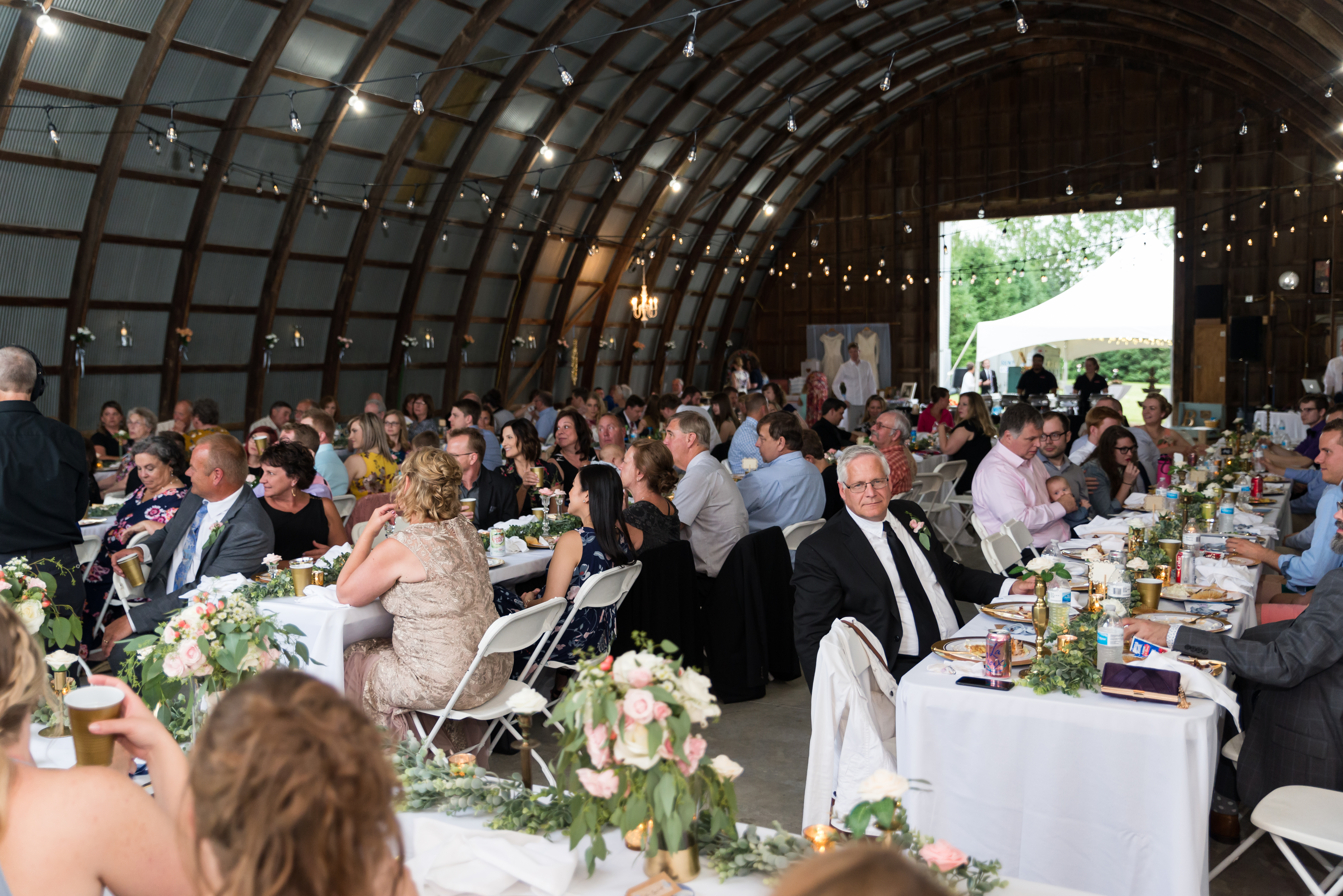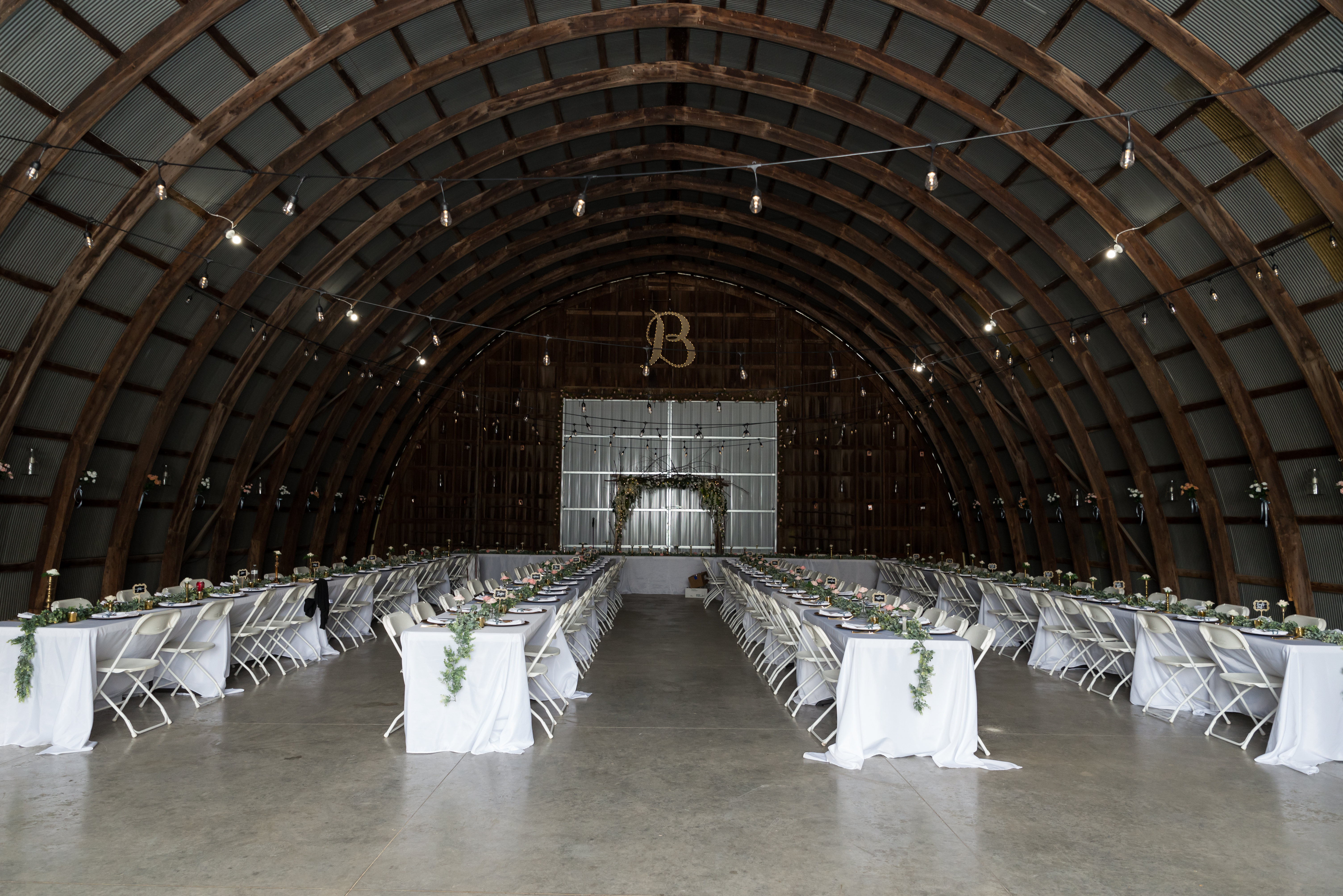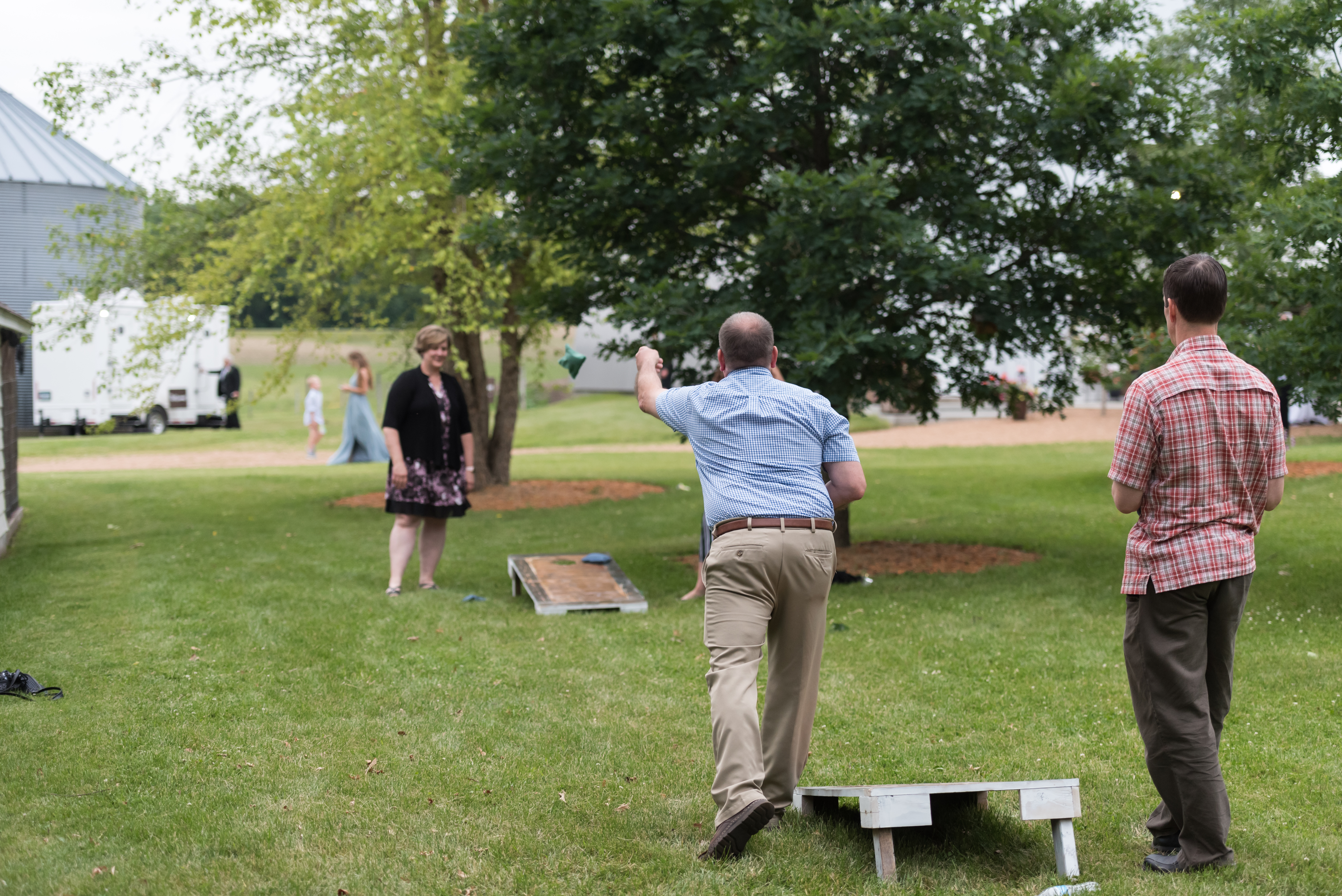 We had our reception in the machine shed, a pretty plain, nondescript building, but it hosts a party really well. I just decorated the crap out of it with lanterns and garlands until hopefully you didn’t walk in and expect a Haybine to hit you in the face. We had a relatively small wedding–we invited 175 people and 150 people showed up. We had a huge head table and then four reception tables, arranged Hogwarts Great Hall style. Famous Dave’s did a buffet (though I made sure to have as many vegetarian options as possible) and Thirsty Whale Bakery made our Lemon Raspberry, Red Velvet, and Mocha Fudge cakes. We did all the speeches and the dances. I do not like cheesy weird traditions (though if you do, great, we’re all different!) so there was no shoe game, dollar dance, garter toss, bouquet toss, or anything else uncomfortable.
