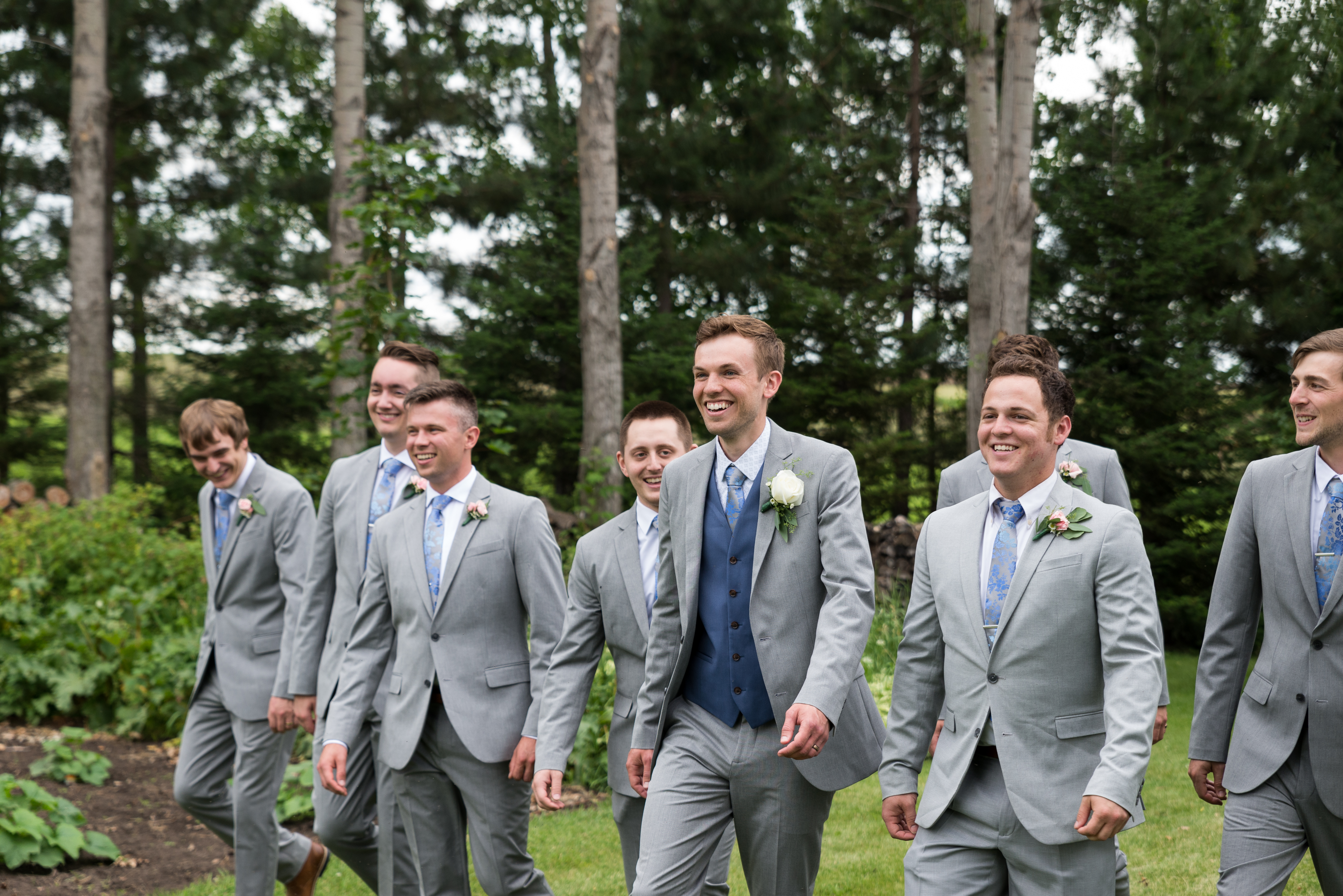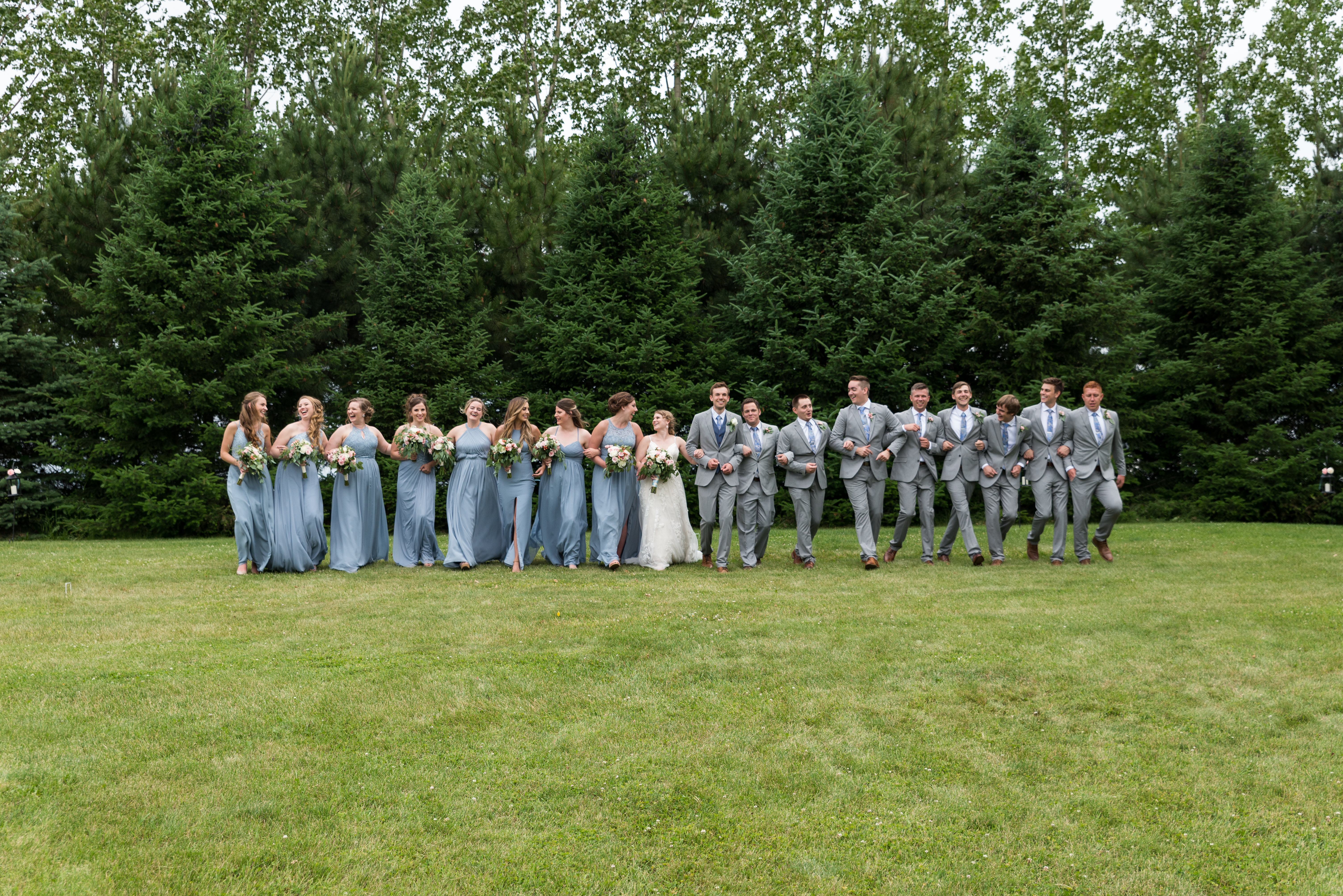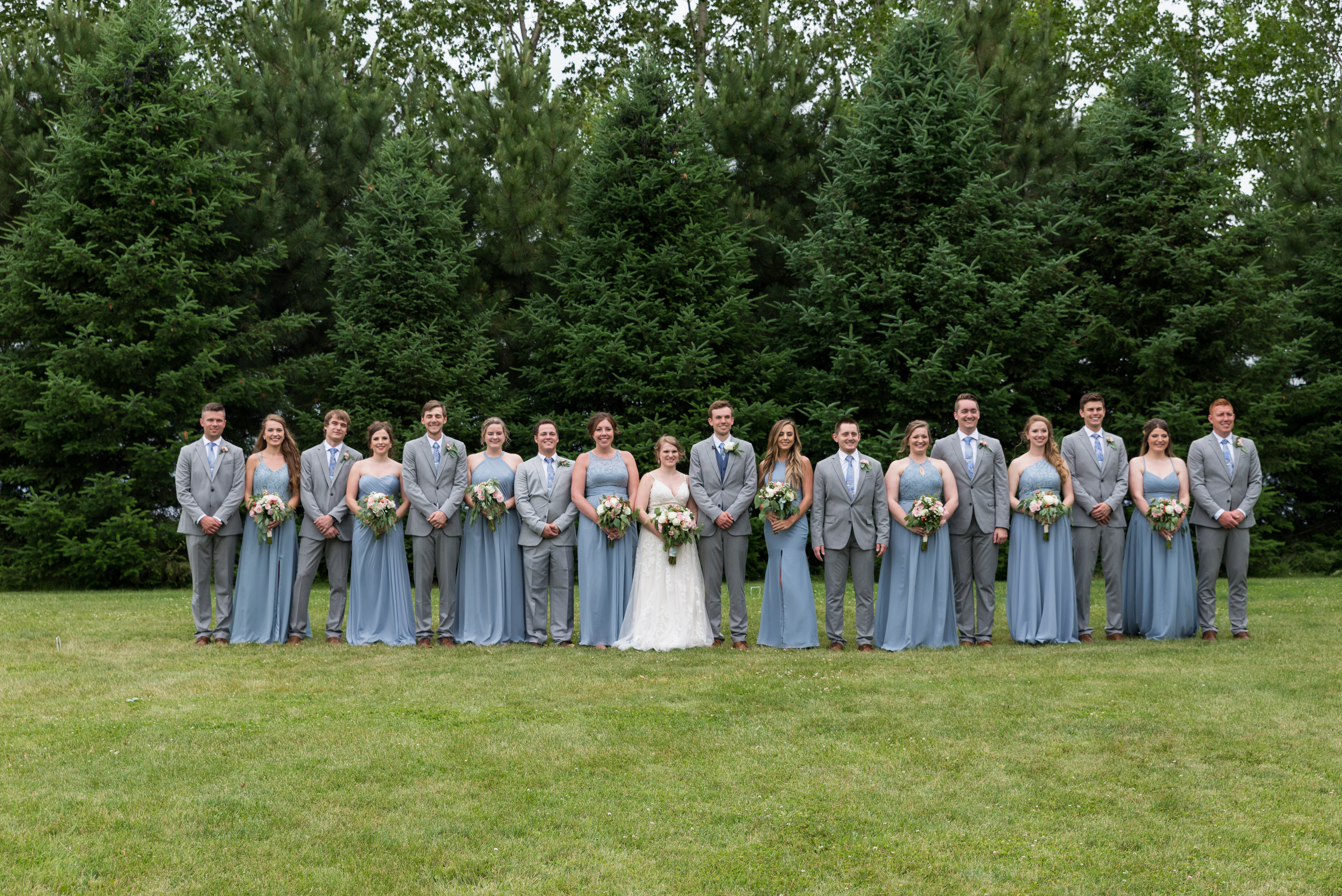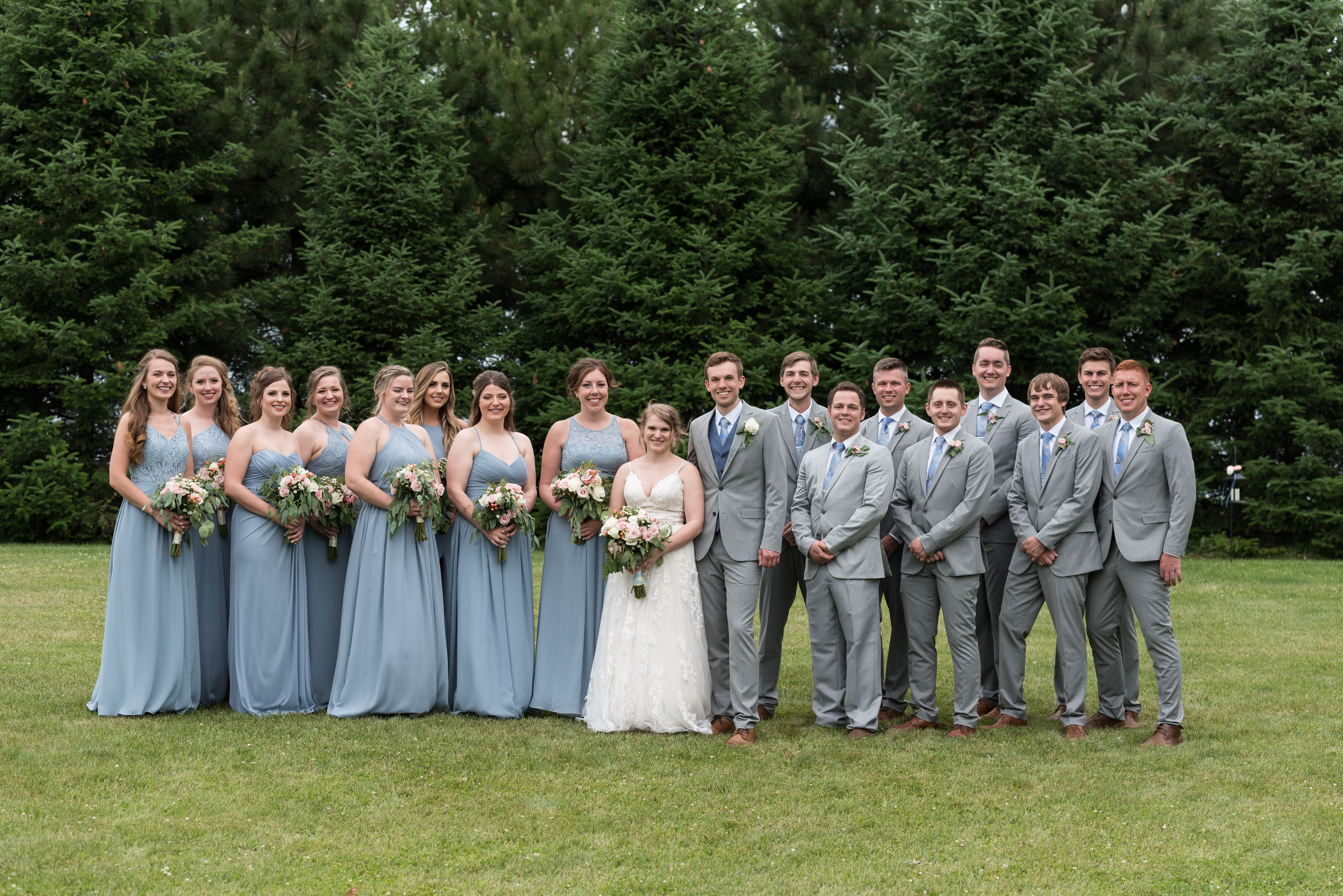 We had a large wedding party of eight bridesmaids and eight groomsmen (and most of them were related to me!). Erik and I each have one sibling, so we included them, six of my cousins, and eight of our friends. At the time we didn’t have any nieces or nephews, and I didn’t want to corral little children, so we opted to not have flower or ring children (okay sorry, that sounds like a horror movie thing).