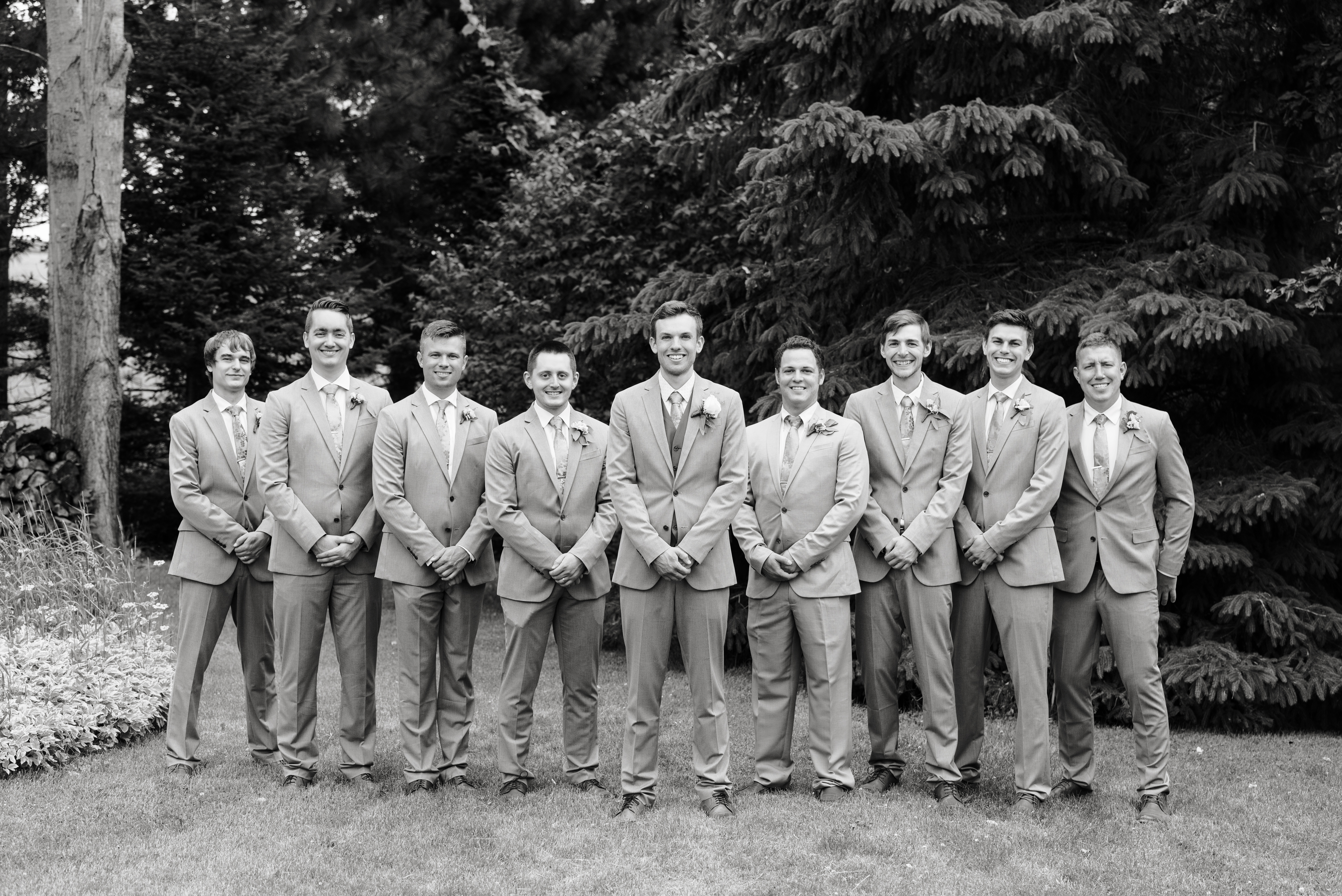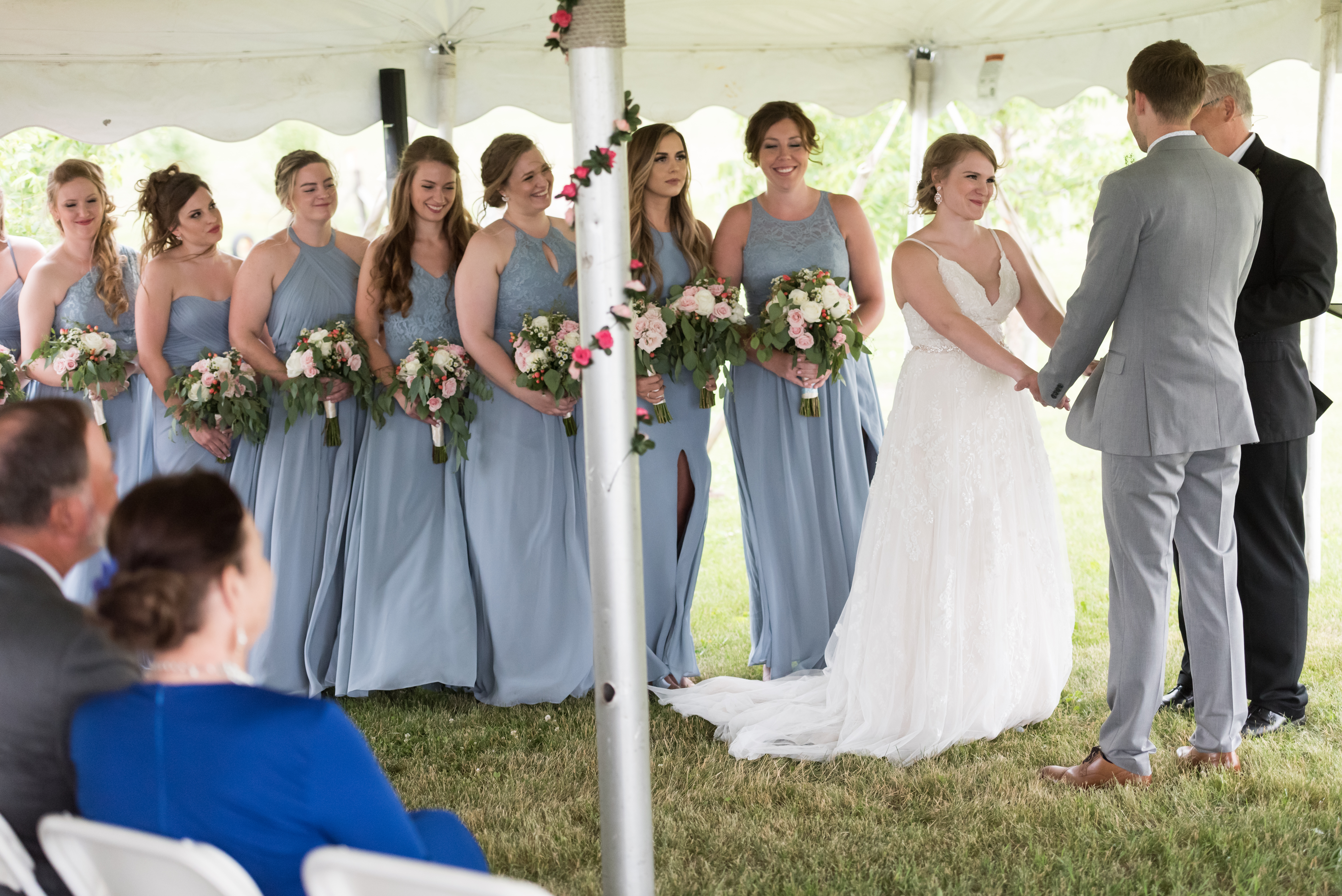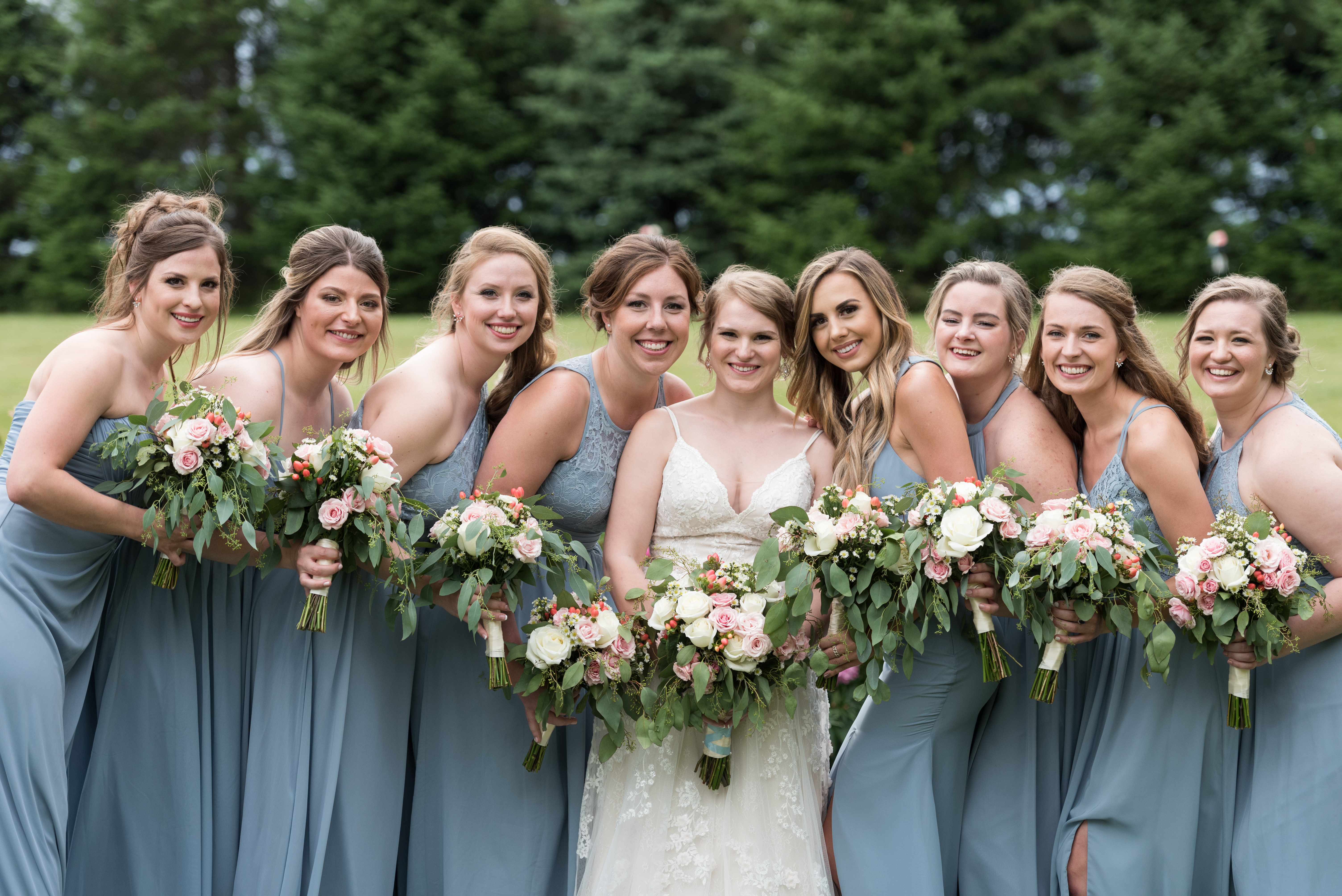 We had a large wedding party of eight bridesmaids and eight groomsmen (and most of them were related to me!). Erik and I each have one sibling, so we included them, six of my cousins, and eight of our friends. At the time we didn’t have any nieces or nephews, and I didn’t want to corral little children, so we opted to not have flower or ring children (okay sorry, that sounds like a horror movie thing).