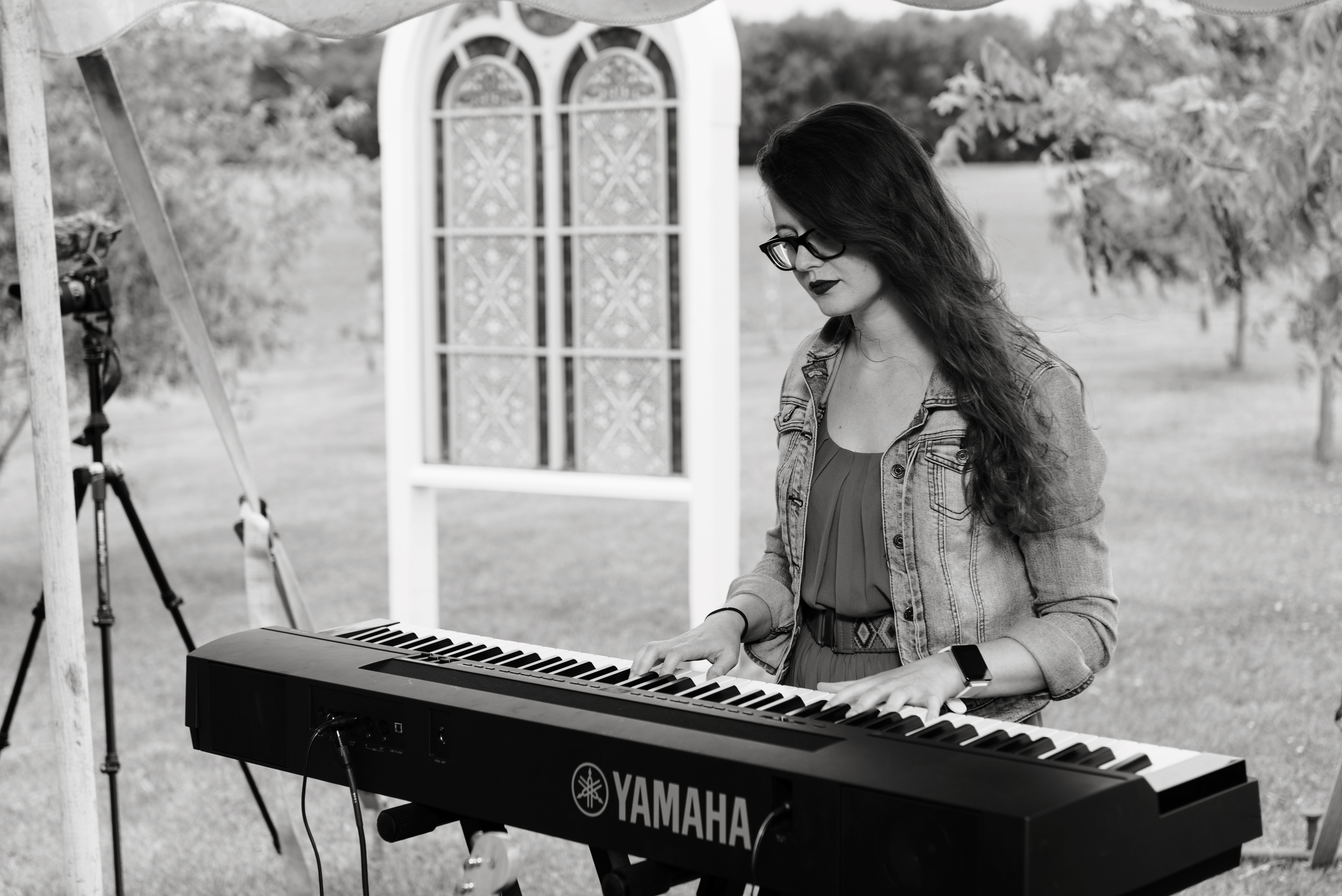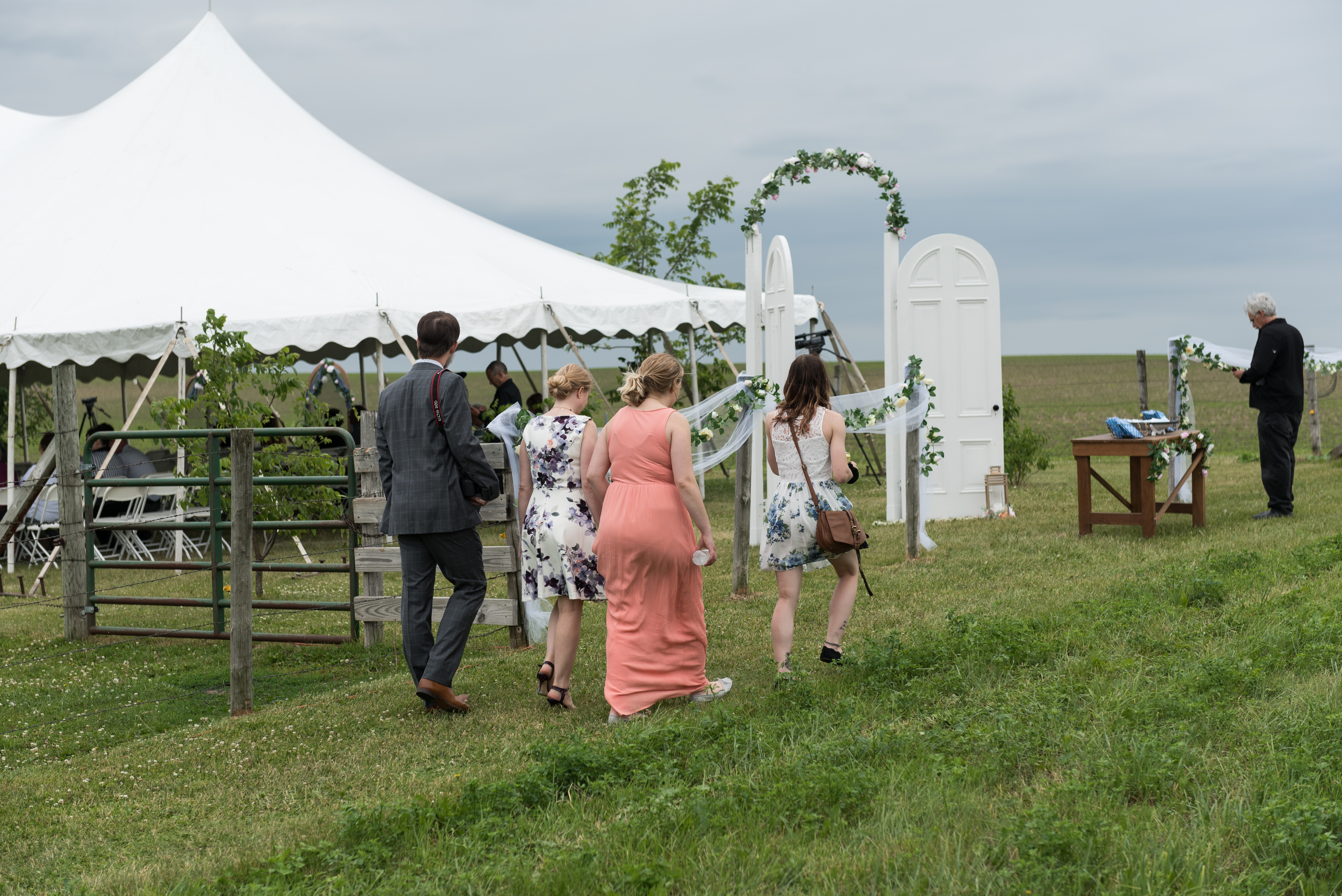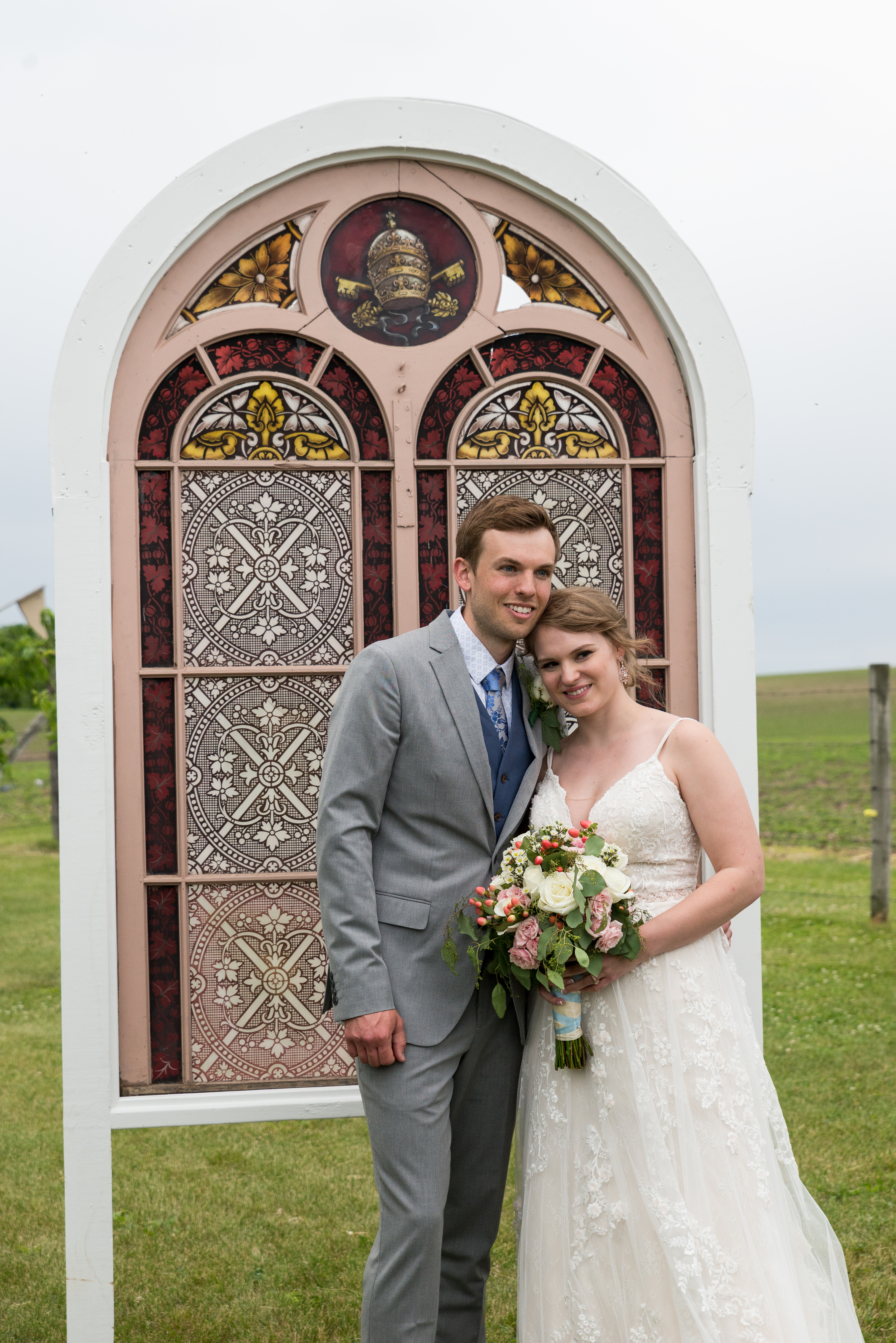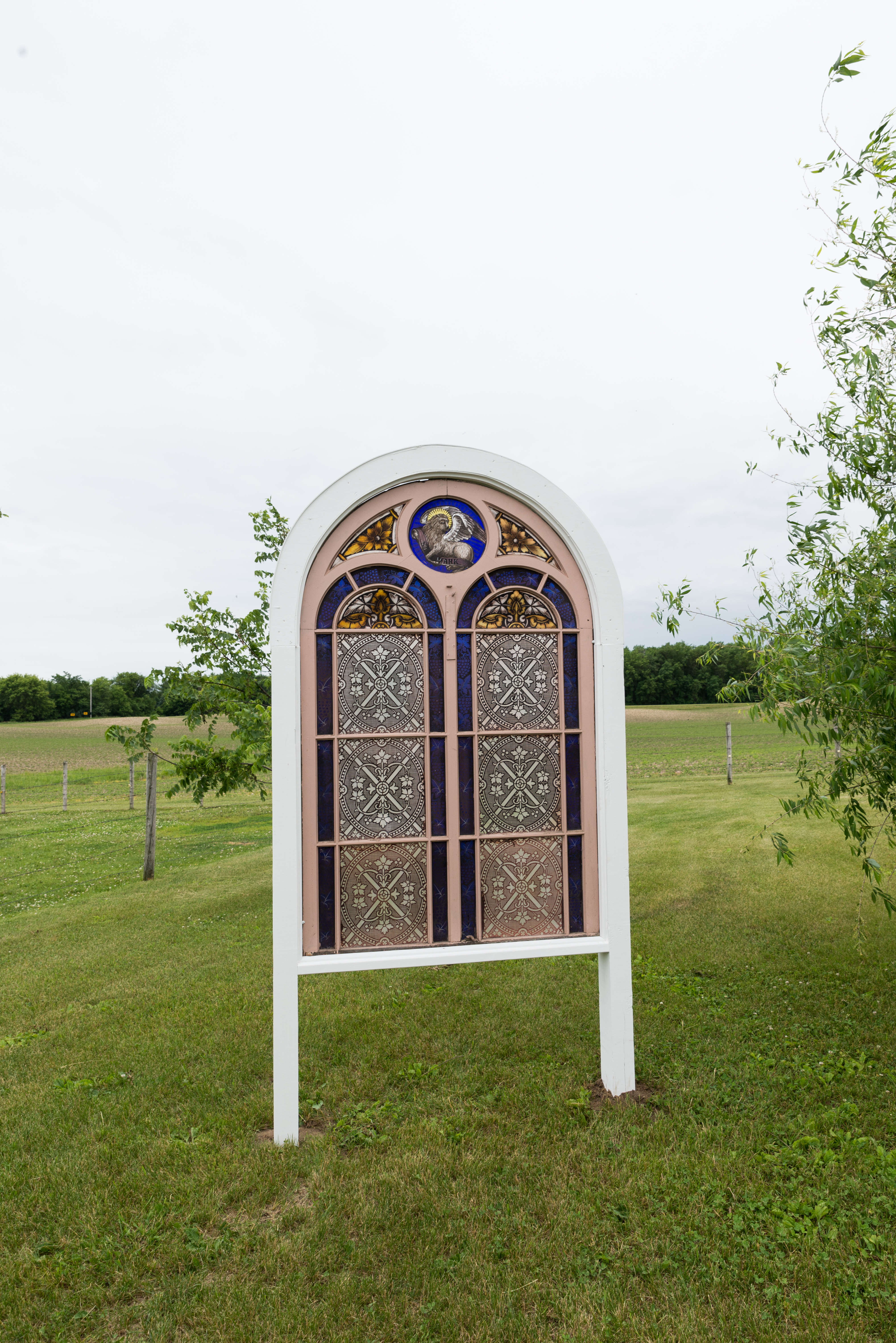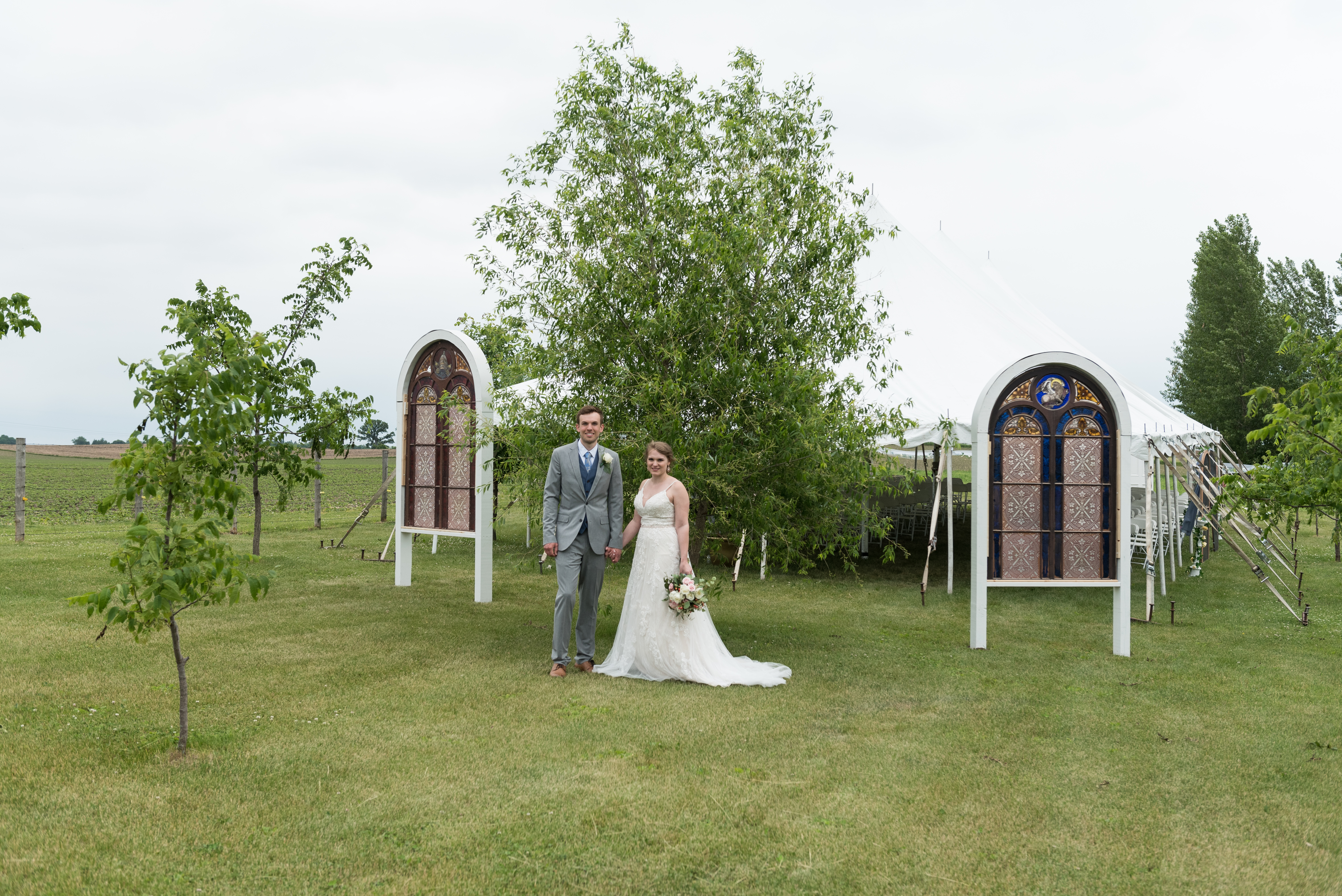 We had the ceremony next to the donkey pasture, in front of my grandmother’s willow. At the head of the space, on either side of the willow, were stained glass windows from St. Benedict that my father built frames for. At the entrance of the space, were two doors from St. Benedict my father built into an open doorway. Lining the sides were window screens from St. Benedict. I wanted to recreate the atmosphere of the church that meant so much to my family in the open air. The only downside was it was expected to rain, and last minute I had to cover everything with a tent. This is my biggest regret about the day–not getting married under the open sky. Everything else was just as I envisioned it, though.