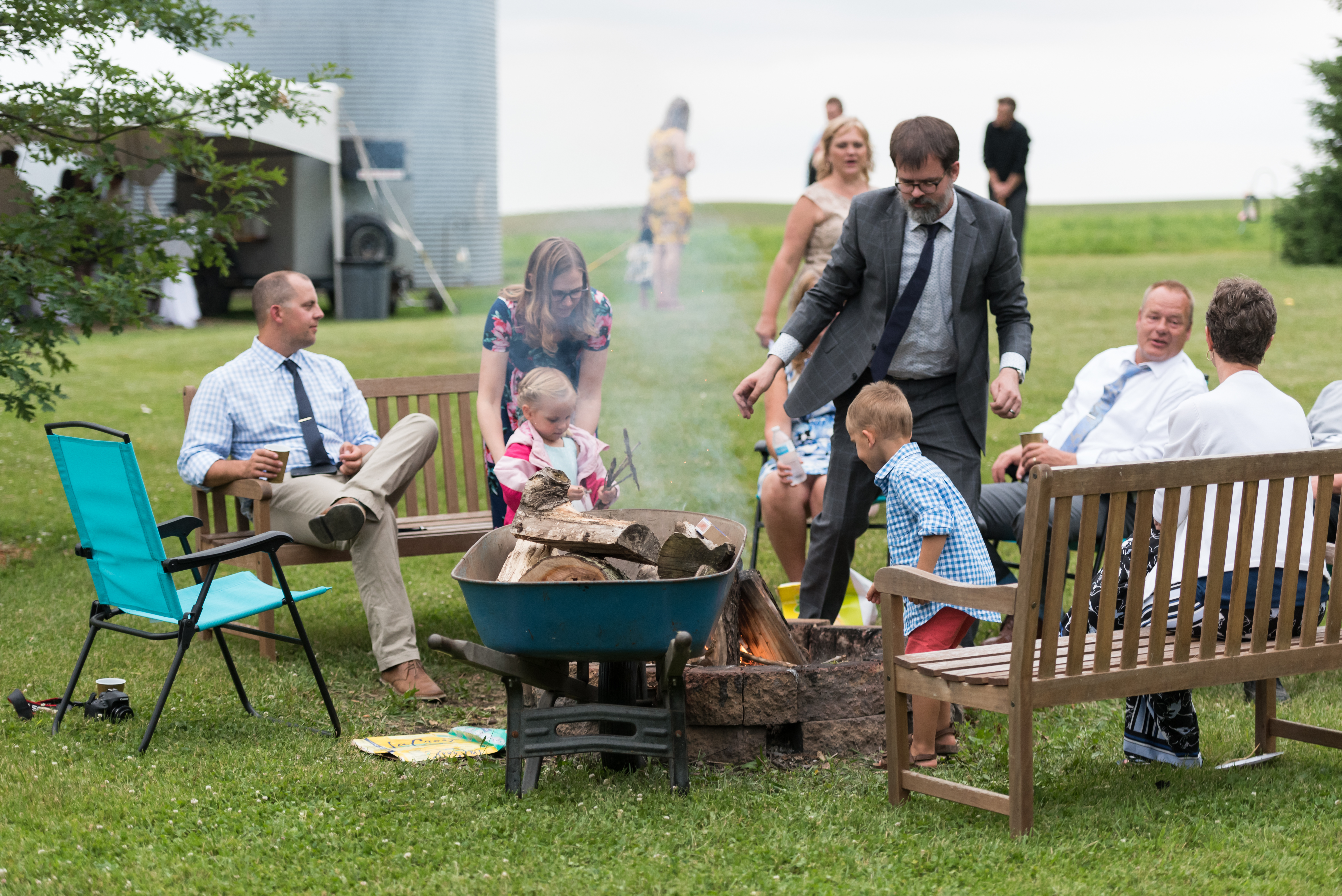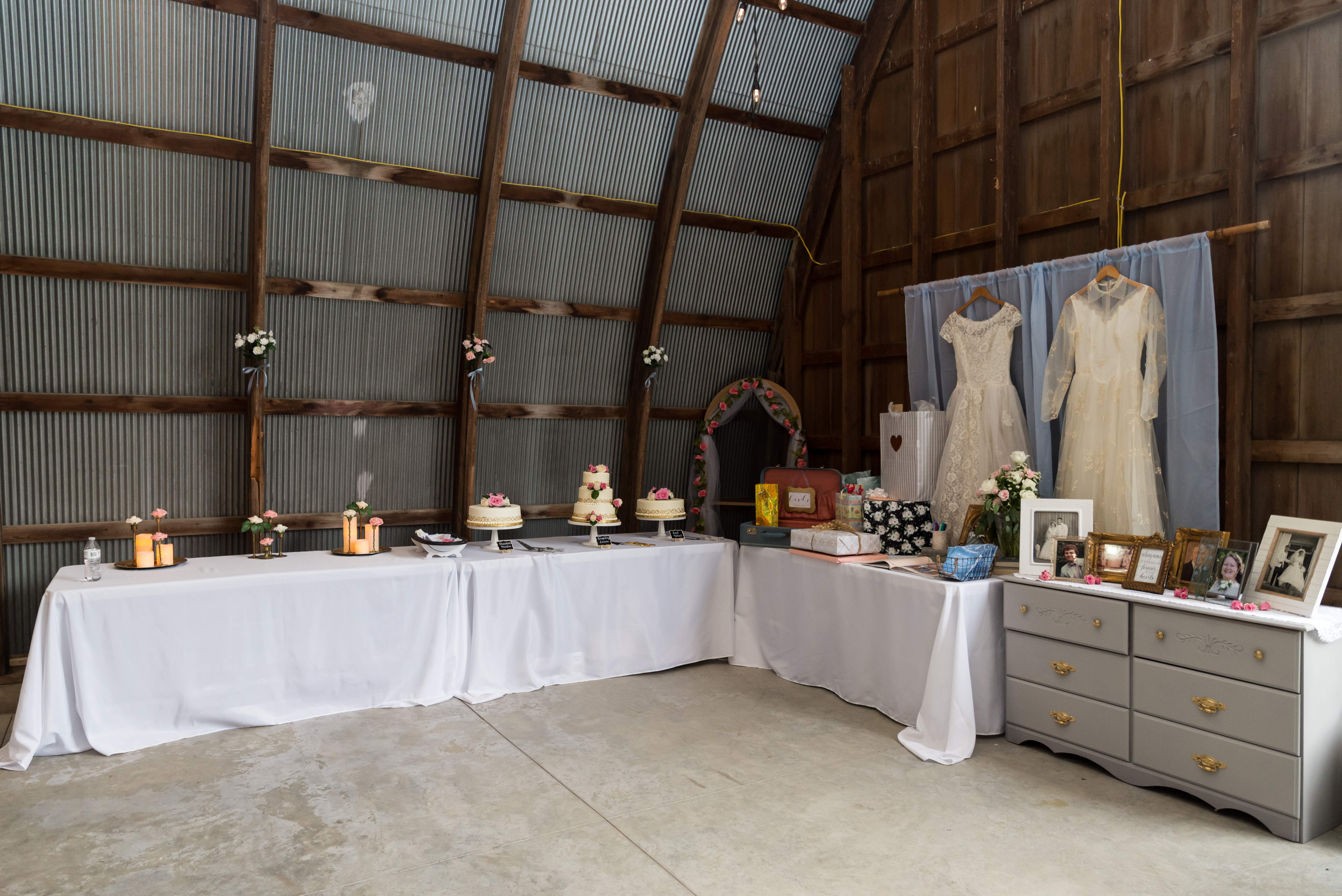 At this point, all of my grandparents were gone and my aunt had just died a few months before. I wanted echoes of them around beyond just the memory table. I was fortunate enough to have access to both my grandmothers’ wedding dresses, so we hung them up in the reception area. I had a basket of handkerchiefs for guests to take at the ceremony and made sure to have some that were embroidered with my aunt’s favorite bird. The suitcase that held our cards was the one my Grandma Busch took with her every time she went to the hospital to have a baby (8 times!). The place we were getting married was where my Grandpa Busch was born and grew up, and where my grandparents had lived most their lives. The tree we got married in front of was a sapling from a willow from Grandma Brooks’ farm.